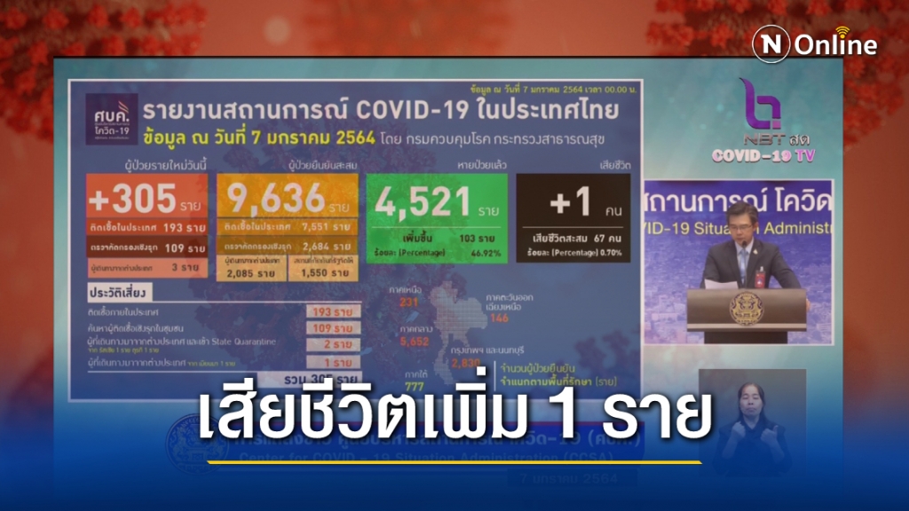 7 มกราคม 2564 เมื่อเวลา 11.30 น. ศูนย์บริหารสถานการณ์การแพร่ระบาดของโรคติดเชื้อไวรัสโคโรนา 2019 (โควิด-19) หรือ ศบค. รายงานพบผู้ป่วยโควิด-19 รายใหม่ จำนวน 305 ราย และมีผู้เสียชีวิตเพิ่ม 1 ราย ขณะที่ผู้ติดเชื้อทั่วโลกมีผู้ป่วยรายใหม่พุ่งสูงมากถึง 682,218 ราย ส่งผลให้ยอดรวม 87,501,801ล้านคน