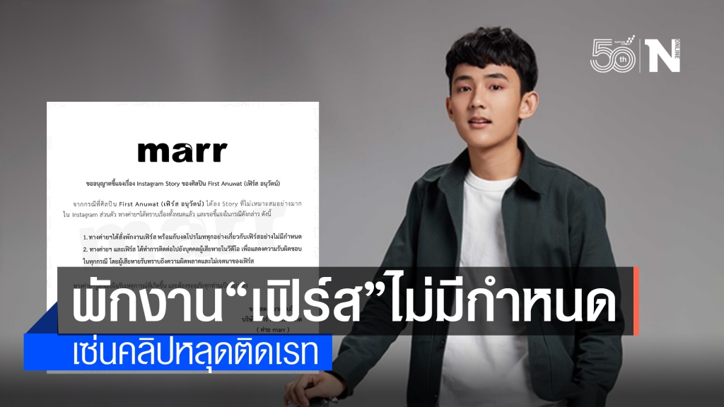 ล่าสุดทางต้นสังกัดอย่าง "marr" ก็ได้โพสต์จดหมายชี้แจงกรณีดังกล่าว พร้อมเผยบทลงโทษศิลปินหนุ่มด้วยการสั่งพักงานและงดการโปรโมทผลงานทุกอย่างของเฟิร์สอย่างไม่มีกำหนด