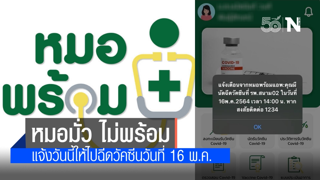 วันนี้(21 พ.ค.)แอปพลิเคชั่น หมอพร้อม มีปัญหาอีกแล้ว ทำให้ผู้ใช้บริการจองฉีดวัคซีน สับสน เพราะวันนี้ 21 พฤษภาคม แล้ว แต่ให้ไปฉีดวัคซีนวันที่ 16 พฤษภาคม ที่โรงพยาบาลสนาม 02 แห่โชว์ภาพกันในกลุ่ม อย่างไรก็ตามเมื่อเวลาประมาณ 07.37 น. มีข้อความจากหมอพร้อม ส่งมาใหม่แจ้งว่า "หมอพร้อมต้องขออภัยกับข้อความที่แจ้งเตือน ที่เลยกำหนดเวลาไปแล้ว เนื่องจากขณะนี้กำลังอยู่ในช่วงทดสอบระบบการแจ้งเตือน"