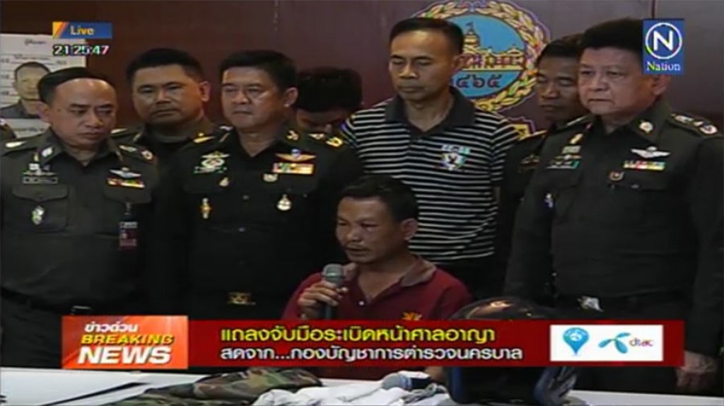 ที่กองบัญชาการตำรวจนครบาล(บช.น.) เมื่อเวลา 21.00 น. วันที่ 8 มีนาคม พล.ต.ท.ประวุฒิ ถาวรศิริ ผู้ช่วยผบ.ตร. พล.ต.ท.ศรีวราห์ รังสิพราหมณกุล ผบช.น. พล.ต.ต.สมบัติ มิลินทจินดา ผบก.สส.บช.น. พ.ต.อ.อัครเดช พิมลศรี รรท.ผบก.ป. พล.ต.ต.อิทธิพล พิริยะภิญโญ รองผบช.น.รรท.ผบก.น.2 พ.ต.อ.อารยะพันธุ์ พุกบัวขาว รองผบก.น.2 พ.ต.อ.ภานุเดช สุขวงศ์ ผกก.สน.พหลโยธิน พ.ต.ท.จักรพงษ์ จักรษุรักษ์ รองผกก.ป.สน.พหลโยธิน พ.ต.ท.เฉลียง อินทิพย์ พงส.ผนพ.สน.พหลโยธิน พร้อมด้วยเจ้าหน้าที่ฝ่ายสืบสวนสน.พหลโยธิน และเจ้าหน้าที่ทหารนำโดย พล.ท.พงษ์สวัสดิ์ พรรณจิตต์ ผู้บัญชาการกองพลที่ 1 รักษาพระองค์ พ.อ.วิจารณ์ จดแตง ผอ.กฎหมายผู้อำนวยการกอ.รมน. หัวหน้าส่วนปฏิบัติการคณะทำงานกฎหมายส่วนรักษาความสงบคสช. พ.ต.อ.กำธร อุ่ยเจริญ ผกก.กลุ่มงานเก็บกู้และตรวจพิสูจน์วัตถุระเบิด(อีโอดี) และเจ้าหน้าที่ตำรวจพิสูจน์หลักฐาน ร่วมกันแถลงความคืบหน้ากรณีเหตุคนร้ายขว้างระเบิด บริเวณด้านหน้าศาลอาญารัชดา เมื่อช่วงค่ำของวันที่7มี.ค.ที่ผ่านมา เวลาประมาณ19.45น. ว่า สามารถจับกุมตัวนายยุทธนา เย็นภิญโญ อายุ 34 ปี ชาวจ.ปทุมธานี ซึ่งมีการต่อสู้เจ้าหน้าที่จนถูกยิงได้รับบาดเจ็บรักษาตัวอยู่ที่โรงพยาบาลและได้ควบคุมตัวนายมหาหิน ขุนทอง อายุ 34 ปี ชาวจ.ยโสธร มาแถลงข่าวต่อสื่อมวลชน พร้อมได้นำรายละเอียดพยานหลักฐาน เช่น รถจักรยายนต์ หมายเลขทะเบียน วงต 967 กรุงเทพมหานคร ผ้าพันคอสีขาวมีข้อความเขียนอพปช. อาสาสมัครพิทักษ์ประชาธิปไตยแห่งชาติ มีด โทรศัพท์มือถือ พาสปอต ทะเบียนบ้าน บัญชีธนาคาร ข้อความสั่งการผ่านแอพพลิเคชั่นไลน์ เอกสารสำคัญอื่นๆ