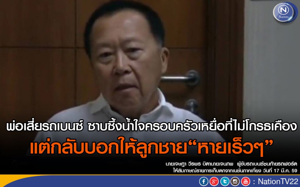เมื่อเวลา 12.00 น.วันที่ 17 มีนาคม 59 นายเจษฎา วีรพร บิดาของนายเจนภพ วีรพร อายุ 37 ปี ผู้ขับรถเบนซ์ ชนท้ายรถยนต์ฟอร์ด ทำให้นิสิตปริญญาโท เสียชีวิต 2 ราย เมื่อวันที่ 13 มีนาคมที่ผ่านมา ได้ให้สัมภาษณ์รายการเก็บตกจากเนชั่นภาคเที่ยง ขณะเข้าเยี่ยมลูกชายที่รพ.สมิติเวช สุขุมวิท ว่า ในวันที่เกิดเหตุ ตนอยู่ที่จ.ภูเก็ต ทันทีทีทราบข่าว ได้รีบเดินทางเพื่อที่จะกลับกรุงเทพฯ แต่ระหว่างนั้นได้ประสานให้เพื่อนเข้าไปช่วยเหลือก่อน ซึ่งตอนนั้นตนคิดว่าจะต้องเดินทางกลับมาให้เร็วที่สุด และเมื่อเดินทางกลับมาถึงกรุงเทพฯแล้ว ตนได้เดินทางไปเคารพศพ น.ส.ธันฐภัทร์ ฮ้อแสงชัย หรือเบนซ์ หนึ่งในผู้เสียชีวิต ทันที