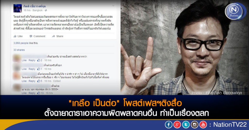 ล่าสุด นายกิตติ เชี่ยววงศ์กุล นักแสดง นักเขียนบท ผู้กำกับละครชื่อดัง หรือที่รู้จักกันในชื่อ "เกลือ เป็นต่อ" โพสต์เฟสบุ๊คแสดงความเห็น ไม่ชอบการตั้งฉายาตั้งฉายาดารา รู้สึกเหมือนว่าเป็นการตีตราคนด้วยอคติ นำความผิดพลาดคนอื่น มาล้อเป็นเรื่องตลก โดยมีข้อความดังนี้