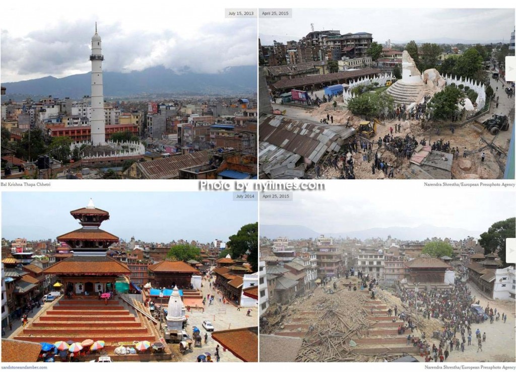 ล่าสุดสำนักข่าวและสื่อโซเชียลมีเดียต่างๆ ก็ได้เผยภาพก่อนเกิดแผ่นดินไหว และหลังเกิดแผ่นดินไหว แสดงให้เห็นถึงเสียหายที่เกิดขึ้นในพื้นที่ประวัติศาสตร์ของเมืองหลวงเนปาล อาคารบ้านเรือนและโบราณสถานที่มีความสำคัญทางประวัติศาสตร์ของเนปาล ได้รับความเสียหายอย่างหนัก โดยเฉพาะอย่างยิ่ง หอคอยดาราห์รา และวัดเก่าแก่อายุหลายร้อยปี ชื่อ วัดมายุ เดวัล