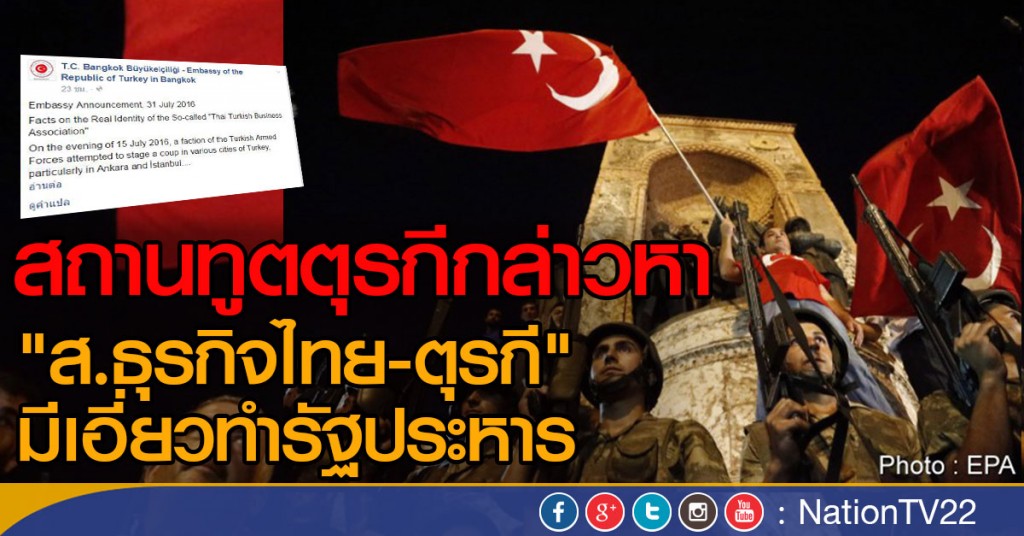 เมื่อวันอาทิตย์ (31 ก.ค.59) เฟซบุ๊คของสถานเอกอัครราชทูตตุรกีประจำประเทศไทย ได้โพสต์ข้อความว่า กลุ่มที่เรียกตัวเองว่า สมาคมธุรกิจไทย-ตุรกี มีส่วนเกี่ยวข้องกับความพยายามทำรัฐประหารเมื่อวันที่ 15 กรกฎาคมที่ผ่านมา โดยกลุ่มนี้มีเครือข่ายในโรงเรียน บริษัท ธนาคาร และสื่อมวลชนจำนวนมาก เพื่อใช้ฟอกเงินและประชาสัมพันธ์ความเคลื่อนไหวของกลุ่ม