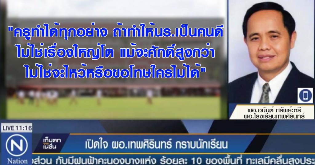ผอ.โรงเรียนเทพศิรินทร์ กล่าวต่ออีกว่า เด็กไม่ได้บอกให้ผอ.ก้มลงกราบ แต่ตนขอโทษแล้ว ด้วยอารมณ์ร้อนของเด็กวัยรุ่นเลยไม่ยอม ตนเลยบอกเด็กว่างั้นคุกเข่าขอโทษก็ได้ และเด็กก็คุกเข่าตามลงมารับ แต่เด็กยังมีอารมณ์ไม่พอใจอยู่เพราะมันเกินเวลาไปจริงๆ ตนเลยบอกว่าหรือจะให้กราบเลย เด็กนักเรียนบอกว่าไม่ต้อง เพราะฉะนั้นในภาพที่เห็นคือกำลังก้มประมาณครึ่งกราบ ไม่ได้จะลงไปกราบ แต่เด็กห้ามไว้
