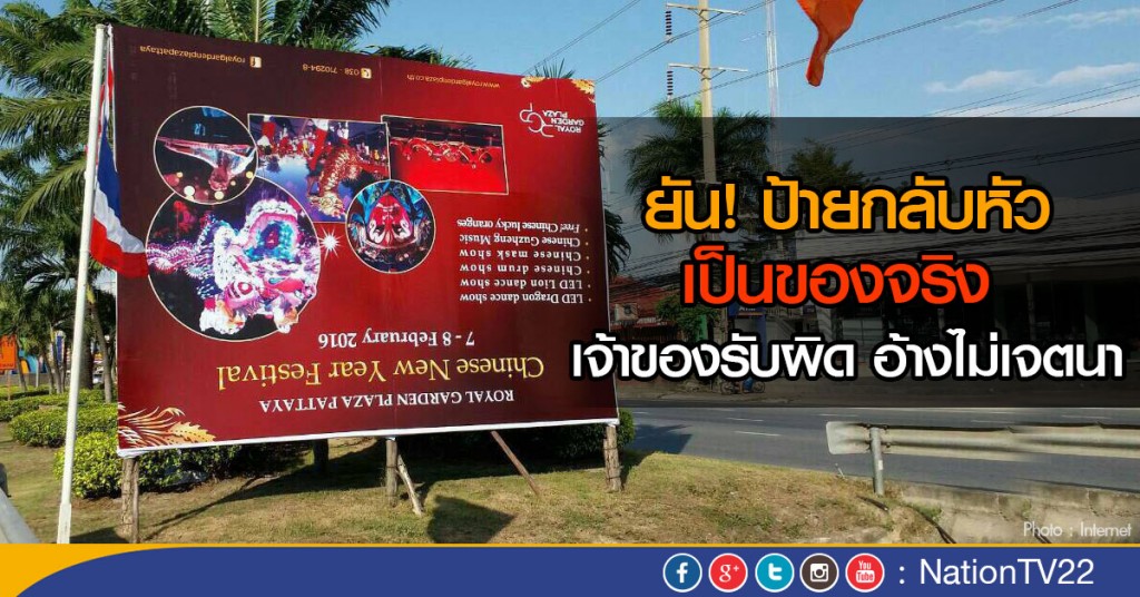 เจ้าหน้าที่รอยัล การ์เด้น พลาซ่า พัทยา บอกต่ออีกว่า ฝ่ายมาร์เก็ตติ้งของ รอยัล การ์เด้น ฯ ได้ไปว่าจ้างให้บริษัทออร์แกไนซ์ ปิดป้ายโฆษณาประชาสัมพันธ์ แต่มีการไปติดผิดพลาดกลับหัวกลัวหาง จึงได้สั่งการให้ออแกไนซ์ที่รับผิดชอบไปแก้ไข และขณะนี้ได้ดำเนินแก้ไขให้ถูกต้องแล้ว