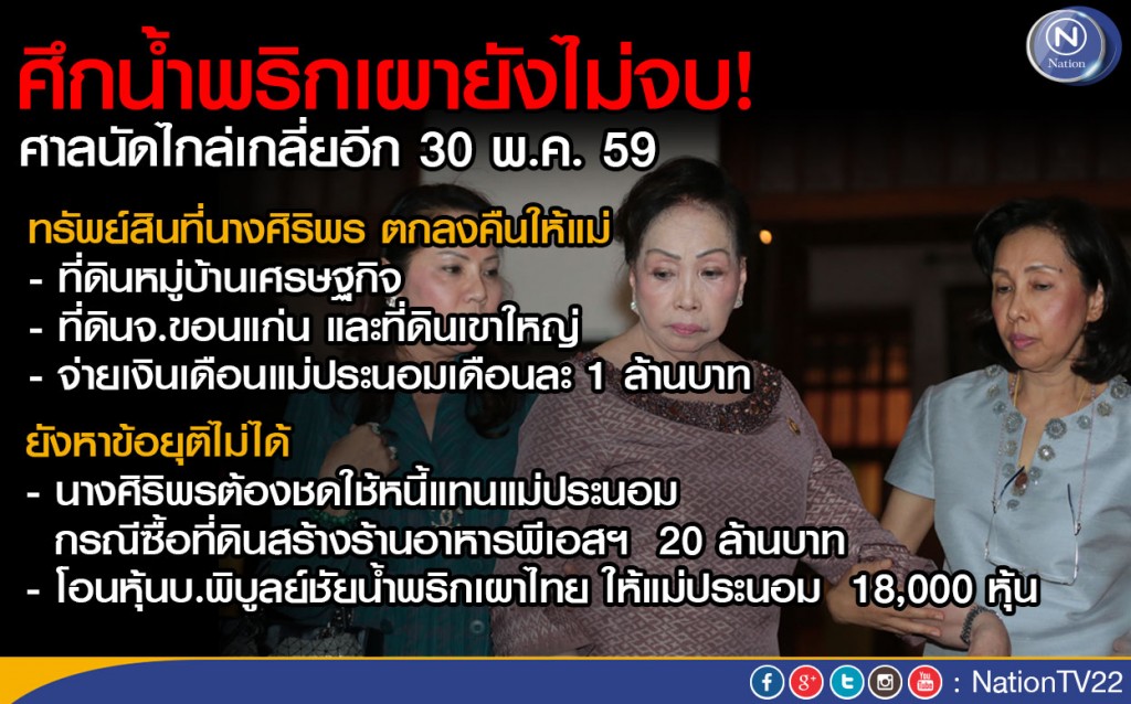 วันที่ 11 เมษายน 59 นายพิสิทธิ์ ชุติพรพงษ์ชัย ทนายความของนางประนอม ได้เดินทางไปที่ศาลจังหวัดตลิ่งชัน ในคดีแพ่งที่นางประนอม และ น.ส.ศิริวัลย์ ร่วมกันเป็นโจทก์ยื่นฟ้อง นางศิริพร บุตรสาวคนโต และนายสุชาติ ภาษาประเทศ สามีนางศิริพร เป็นจำเลยที่ 1-2 ในความผิดเรื่องเพิกถอนถอนนิติกรรม ถือกรรมสิทธิ์แทนโดยคืนทรัพย์ และเรียกค่าเสียหายทุนทรัพย์รวม 561,950,000 บาทนายพิสิทธิ์ เปิดเผยว่า วันนี้ได้มีการไกล่เกลี่ยกับทางทนายของนางศิริพร โดยทิศทางของคดีส่วนใหญ่มีข้อสรุปที่ตรงกันว่าจะยุติการฟ้องร้องโดยจะทำสัญญาประนีประนอมต่อกัน แต่ก็มีบางเรื่องที่มีข้อยุติที่ไม่ตรงกัน ในส่วนที่มีข้อยุติตรงกันคือ นางศิริพรจะคืนที่ดินในหมู่บ้านเศรษกิจ รวมถึงที่ดินที่จังหวัดขอนแก่น และที่ดินที่เขาใหญ่ จ.นครราชสีมา ให้กับนางปะนอม ส่วนเรื่องเงินเดือนที่ตกลงกันว่านางศิริพรจะต้องให้นางปะนอมทุกเดือนๆ ละ 1 ล้านบาท จะให้ตามที่ได้ตกลงกันก่อนหน้านี้