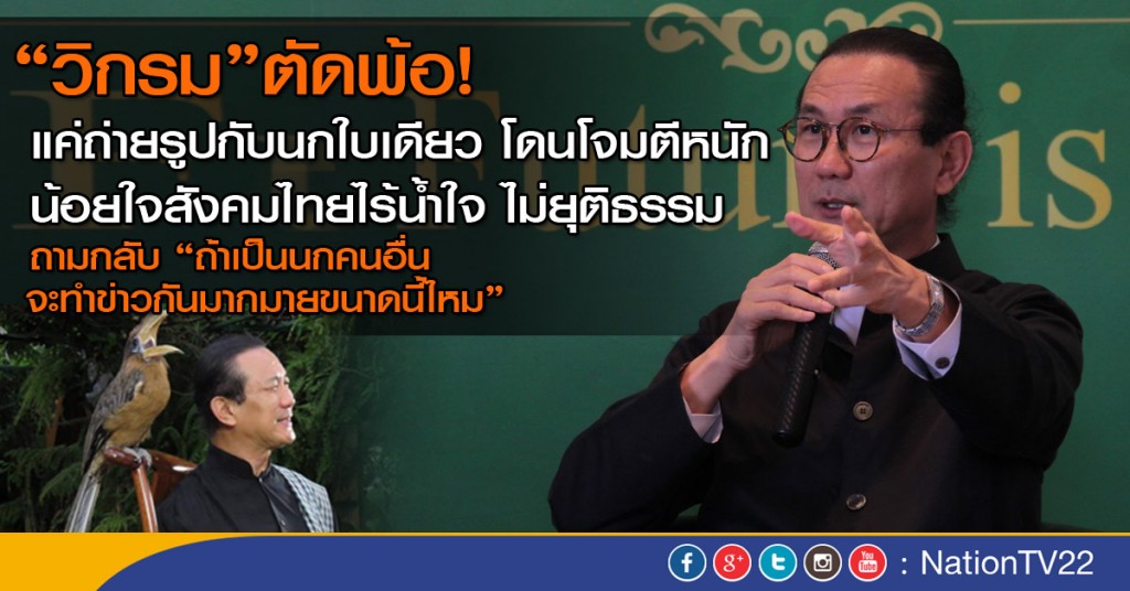 กรณีนายวิกรม กรมดิษฐ์ นักธุรกิจ นักคิด นักเขียน โพสต์ภาพถ่ายคู่นกเงือกสีน้ำตาลลงในเฟสบุ๊คของตนเอง จนเกิดกระแสนักอนุรักษ์ออกมาเรียกร้องให้กรมอุทยานแห่งชาติฯ เข้ามาตรวจสอบเรื่องการครอบครองสัตว์ป่าคุ้มครอง ล่าสุด นายวิกรม ให้สัมภาษณ์ รายการ CEO VISION ทาง FM 96.5 ในช่วงเช้าวันนี้ (24 มิ.ย.59) ชี้แจงประเด็นนกเงือก ว่า ถ้านกตัวนี้เป็นของคนอื่น จะมาทำข่าวกันมากมายขนาดนี้ไหม พร้อมบอกว่า ที่ไม่ได้ออกมาพูดเรื่องนก เพราะยุ่ง ไม่ได้หลีกลี้หนีหน้า ไม่เคยหนีใคร เพราะไม่ใช่เรื่องคอขาดบาดตาย"ผมมีเจตนาดี เคยบริจาคให้กลุ่มอนุรักษ์นกต่างๆ เคยทำดีมากมาย แค่ไปถ่ายรูปกับนกใบเดียว มาโจมตี ไม่แน่ใจ ผมจะทำอะไรดีๆกับสังคมต่อไปไหม ทำไมสังคมไทยไม่มีความยุติธรรม ไม่มีน้ำใจ สำหรับผมอะไรถูกก็ถูก ผิดก็ผิด ผมเป็นสุภาพบุรุษพอ " นายวิกรม กล่าวนายวิกรม ยังกล่าวว่า ตอนนี้รอเจ้าหน้าที่รัฐสรุปเรื่องมาก่อน หลังจากนั้นถ้ายังมีอะไร ก็จะพิจารณารักษาความเป็นธรรมให้ตัวเอง