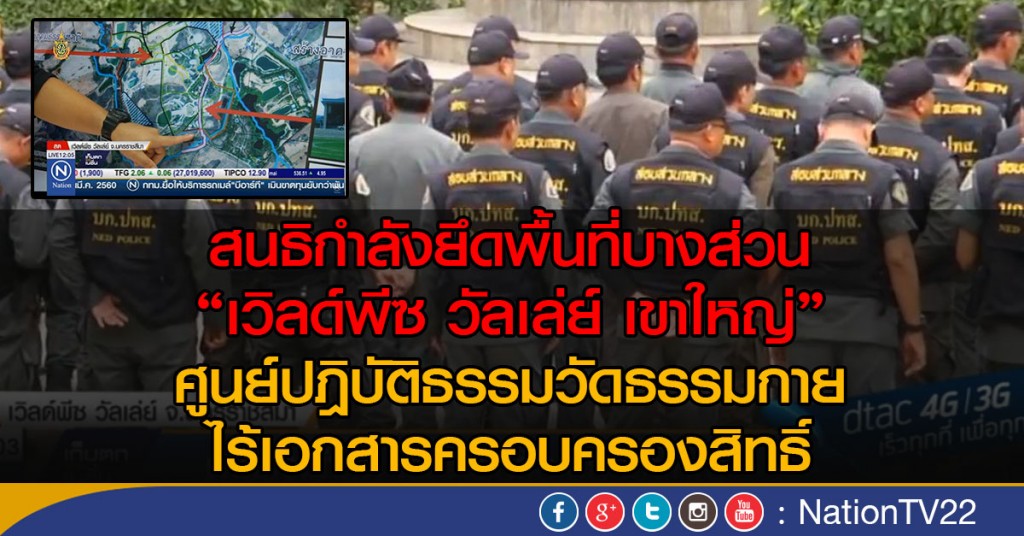 อย่างไรก็ตาม ในส่วนของ ศูนย์ปฎิบัติธรรม เวิลด์พีซ วัลเล่ย์ เขาใหญ่ จากการตรวจสอบหลักฐานเบื้องต้น จากระวางแผนที่ของสำนักงานที่ดินจังหวัด พบว่า มีเนื้อที่ประมาณ 499 ไร่ จำนวนนี้พบมีเอกสารสิทธิ์ 13 แปลง เนื้อที่ 290 ไร่ โดยเป็นโฉนดที่ดิน 3 แปลง 65 ไร่ และน.ส.3 ก.10 แปลง 230 ไร่ ส่วนอีกอีก 7 แปลงที่เหลือ มีเนื้อที่รวม 205 ไร่ ยังไม่พบเอกสารสิทธิ์ ดังนั้น วันนี้ เจ้าหน้าตำรวจจะติดประกาศตรวจยึดในวันนี้ และห้ามบุคคลเข้าพื้นที่หรือกระทำการใดใด ฝ่าฝืนมีความผิดตามกฎหมาย