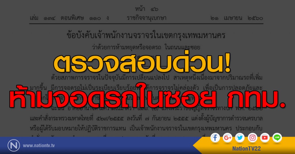 โดยมอบอํานาจให้รองผู้บัญชาการตํารวจนครบาล (งานจราจร) กํากับบริหารราชการสั่งและปฏิบัติราชการแทนผู้บัญชาการตํารวจนครบาลจึงได้ออกข้อบังคับไว้ ดังนี้ "ข้อบังคับเจ้าพนักงานจราจรในเขตกรุงเทพมหานคร ว่าด้วย การห้ามหยุดหรือจอดรถ ในถนนและซอย พ.ศ.2560 ให้ใช้บังคับตั้งแต่วันถัดจากวันประกาศในราชกิจจานุเบกษาเป็นต้นไปห้ามจอดรถตลอดเวลาในถนนและซอย เช่น..