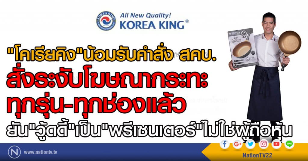 ล่าสุด โคเรียคิง ออกแถลงการณ์ น้อมรับคำสั่ง สคบ. และสั่งระงับการออกอากาศโฆษณาสินค้าทุกรุ่น ทุกช่องแล้ว และเร่งแก้ไขโฆษณาให้เหมาะสม ยัน วู้ดดี้ วุฒิธร มิลินทรจินดา เป็น พรีเซนเตอร์ สินค้าเท่านั้น ไม่ได้เป็นผู้ถือหุ้น ขออภัยวู้ดดี้ ได้รับผลกระทบจากกระแสสังคมไปด้วย