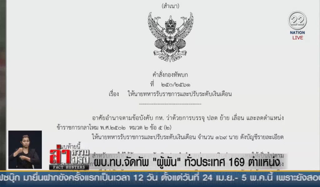 พลเอกเฉลิมชัย สิทธิสาท ผู้บัญชาการทหารบก ได้ลงนามในคำสั่งกองทัพบก ที่ 250/2561 ลงวันที่ 24 เมษายน เรื่องให้นายทหารรับราชการและปรับระดับเงินเดือน จำนวน 169 นาย โดยให้มีผลทันทีตั้งแต่มีคำสั่ง ทั้งหมดเป็นนายทหารระดับ "ผู้บังคับกองพัน" ทั่วประเทศ