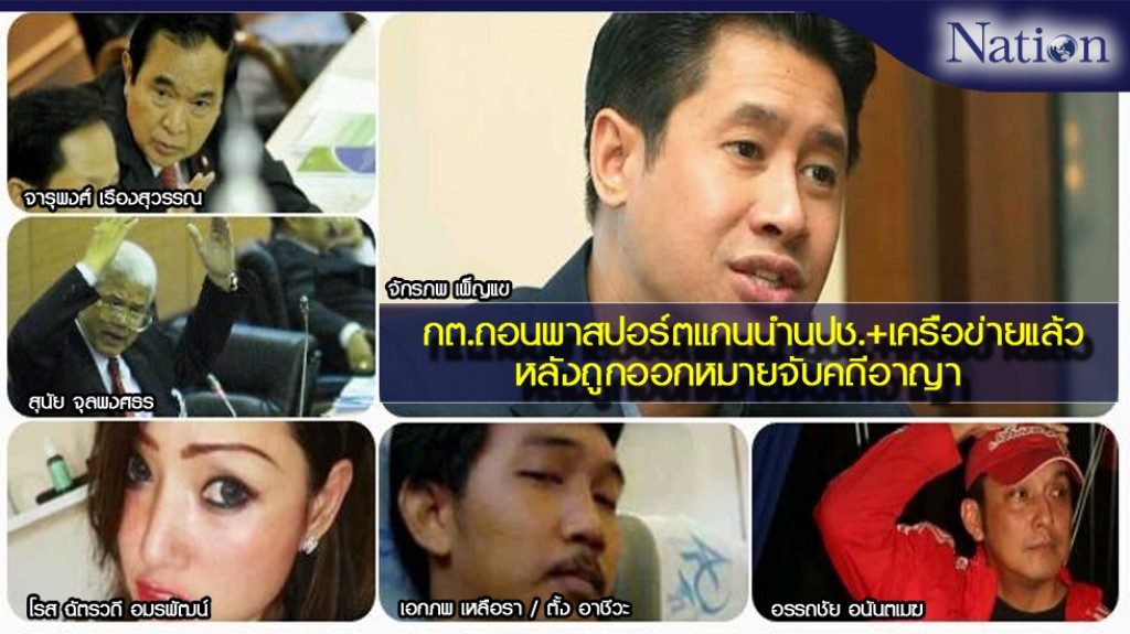 รายงานข่าวแจ้งว่า กระทรวงการต่างประเทศได้ดำเนินการเพิกถอนหนังสือเดินทางของบุคคลที่ถูกออกหมายจับจำนวน 6 ราย ตั้งแต่วันที่ 26 มิ.ย.ที่ผ่านมา ประกอบด้วย นายจารุพงศ์ เรืองสุวรรณ, นายจักรภพ เพ็ญแข, นายสุนัย จุลพงศธร, น.ส.ฉัตรวดี อมรพัฒน์ หรือโรส, นายเอกภพ เหลือรา หรือตั้ง อาชีวะ และนายอรรถชัย อนันตเมฆ ทั้งนี้การยกเลิกหนังสือเดินทางเป็นไปตามระเบียบว่าด้วยการออกหนังสือเดินทาง พ.ศ.2548 ข้อ 23 (2) ที่ระบุว่าเจ้าหน้าที่สามารถยกเลิกหรือเรียกหนังสือเดินทางได้เมื่อปรากฏภายหลังว่าผู้ถือหนังสือเดินทางเป็นบุคคลซึ่งเจ้าหน้าที่ไม่อาจออกหนังสือเดินทางได้ เนื่องจากเป็นผู้ต้องหาคดีอาญาที่ได้มีการออกหมายจับไว้แล้ว ทั้งนี้ถือป็นการดำเนินการตามขั้นตอนปกติ หลังกระทรวงการต่างประเทศได้รับหนังสือจากสำนักงานตำรวจแห่งชาติ(สตช.) ขอให้เพิกถอนหนังสือเดินทางของทั้ง 6 คน ซึ่งเป็นผู้ต้องหาคดีในคดีอาญาที่ได้ออกหมายจับไว้แล้ว