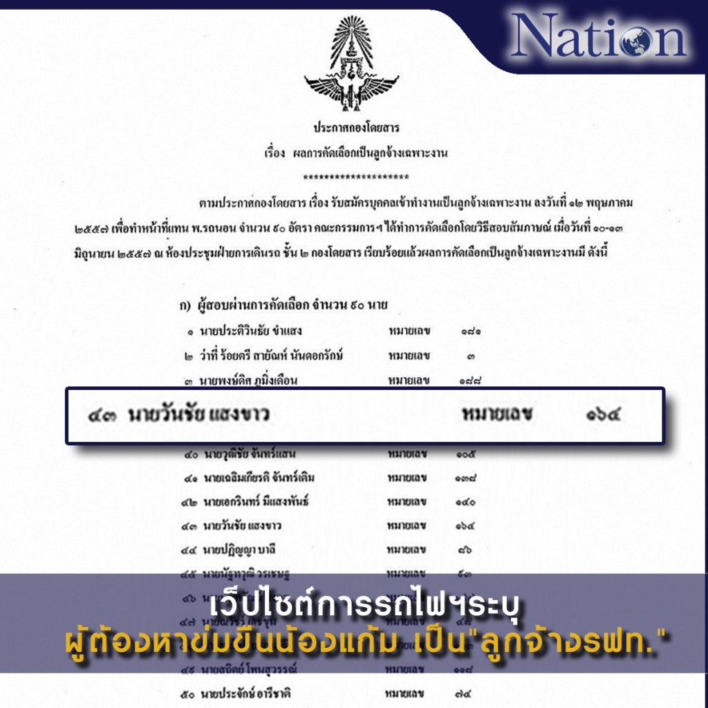เมื่อวันที่ 8 ก.ค. ผู้สื่อข่าวรายงานว่าจากการตรวจสอบในเว็บไซต์ของการรถไฟแห่งประเทศไทย ส่วนฝ่ายการเดินรถ (http://www.trafficsrt.com/home/u_news_detail.php?id=43 ) ซึ่งประกาศผลการสอบคัดเลือกบุคคลเข้าทำงานเป็นลูกจ้างเฉพาะงานลงวันที่ 12 มิ.ย.57 ได้มีชื่อของ นายวันชัย แสงขาว ผ่านการคัดเลือก ในลำดับที่ 43 หมายเลข 164 ซึ่งขัดแย้งกับที่ นายประภัสร์ จงสงวน ผู้ว่าการการรถไฟแห่งประเทศไทย (ร.ฟ.ท.) ที่ระบุว่า นายวันชัย แสงขาว เป็นพนักงานบริษัทที่รับสัมปทานดูแลความสะอาด ไม่ใช่พนักงานการรถไฟฯ