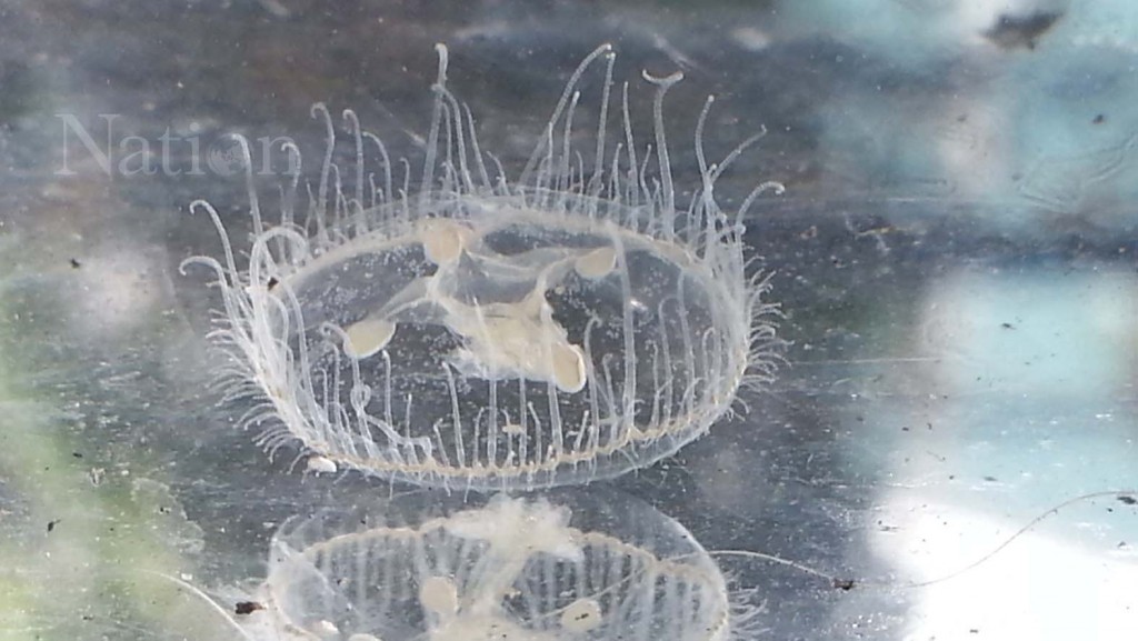 จากนั้น นายชัยวัฒน์ จะใช้อุ่มมือตักขึ้นมาใส่โถแก้วให้ดูอย่างใกล้ชิด พบว่าเป็นแมงกะพรุนน้ำจืด ลำตัวมีขนาดประมาณเท่าปลายนิ้วก้อย ร่างกายมีสีขาวใส และขาวขุ่น มีลำตัวคล้ายร่ม มีหนวด มีเยื่อบางๆ