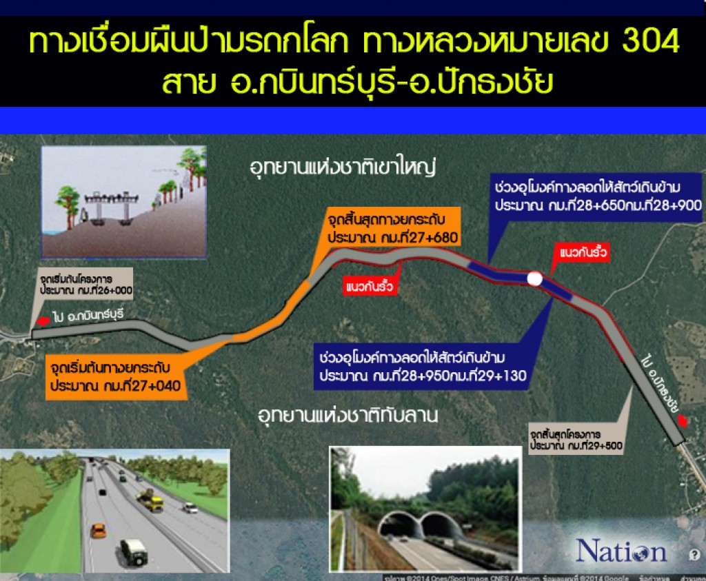 ถนนสายเล็กๆที่คดเคี้ยวตามแนวทิวเขา สองข้างทางโอบล้อมไปด้วยต้นไม้ คือถนนสายนครราชสีมา-บ้านบุไผ่-กบินทร์บุรี หรือที่รู้จักกันในชื่อทางหลวงหมายเลข 304 ถนนสายประวัติศาสตร์ที่ขนาบข้างด้วยอุทยานแห่งชาติ 2 แห่ง คืออุทยานแห่งชาติเขาใหญ่ และอุทยานแห่งชาติทับลาน อ.นาดี จ.ปราจีนบุรี ผืนป่าที่หลายคนรู้จักในชื่อผืนป่าดงพญาเย็น -เขาใหญ่ เป็นพื้นที่อยู่อาศัยของสัตว์ป่าน้อยใหญ่ แถมมีความหลากหลายทางชีวภาพ และเป็นผืนป่าที่ถือว่าอุดมสมบูรณ์ มีความโดดเด่นที่สุดแห่งหนึ่งของประเทศไทย และเมื่อวันที่ 14 กรกฎาคม 2548 ยูเนสโกประกาศให้ผืนป่าดงพญาเย็นเขาใหญ่ เป็นแหล่งมรดกโลกทางธรรมชาติแห่งที่ 2 ของไทยทางหลวงหมายเลข 304 เป็นเส้นทางสายยุทธศาสตร์ที่เชื่อมโยงภาคตะวันออกและภาคตะวันออกเฉียงเหนือเข้าด้วยกัน เส้นทางสายหลักที่รองรับการขนส่งสินค้าจากอีสานสู่ท่าเรือแหลมฉบังและนิคมอุตสาหกรรมภาคตะวันออก กรมทางหลวงจึงบรรจุเส้นทางสายนี้ให้เป็นส่วนหนึ่งในการก่อสร้างขยายเส้นทางเป็น 4 ช่องจราจร มีชื่อว่าโครงการก่อสร้างสายประธานเป็น 4 ช่องจราจร บนทางหลวงหมายเลข 304 ตอน อ.กบินทร์บุรี-อ.ปักธงชัย โดยทยอยสร้างตั้งแต่ปี 2538 การขยายถนนได้ดำเนินการมาอย่างต่อเนื่อง เว้นเพียงบางช่วงคือกม. 26-29และ กม. 42-57 ที่ยังไม่สามารถดำเนินการก่อสร้างได้ เนื่องจากเป็นพื้นที่รอยต่อของอุทยาน 2 อุทยานผืนป่าดงพญาเย็น-เขาใหญ่ ที่ได้รับการขึ้นบัญชีเป็นมรดกโลกทางธรรมชาติ จากการประชุมคณะกรรมการมรดกโลกเมื่อปี 2548 จากนั้นในปี 2552 กรมทางหลวง ได้ให้บริษัทที่ปรึกษาจัดทำรายงานผลกระทบด้านสิ่งแวดล้อม หรือ อีไอเอของโครงการสาย 304 เพื่อแก้ปัญหาที่จะกระทบกับสิ่งแวดล้อมในพื้นที่นี้อดุลย์ เชาว์วาทิน ผู้อำนวยการสำนักงานทางหลวงที่ 8 (นครราชสีมา) ระบุว่า ที่ผ่านมาได้มีการดำเนินการขยายถนนมาอย่างต่อเนื่องโดยคำนึงถึงความต้องการของประชาชน และรองรับการขยายตัวทางเศรษฐกิจ ปัจจุบันมีรถที่ใช้เส้นทางสายกบินทร์บุรี-อ.ปักธงชัย เฉลี่ยกว่า 20,000 คันต่อวัน ในจำนวนนี้ร้อยละ 30 เป็นรถบรรทุกขนาดใหญ่ ทำให้เกิดอุบัติเหตุเกิดขึ้นบ่อยครั้ง และทำให้มีผู้เสียชีวิตอยู่แทบทุกเดือนในปี 2552 กรมทางหลวงให้บริษัทที่ปรึกษาจัดทำรายงานผลกระทบด้านสิ่งแวดล้อม หรืออีไอเอของโครงการทางหลวงสาย 304 และทางเชื่อมผืนป่ามรดกโลก ใช้เวลาพิจารณานาน 5 ปี กระทั่งวันที่ 23 กรกฎาคม 2557 คณะกรรมการระดับชาติที่พล.อ.ประยุทธ์ จันทร์โอชา หัวหน้าคณะรักษาความสงบแห่งชาติ หรือ คสช.เป็นประธานคณะกรรมการสิ่งแวดล้อม มีมติอนุมัติให้ด