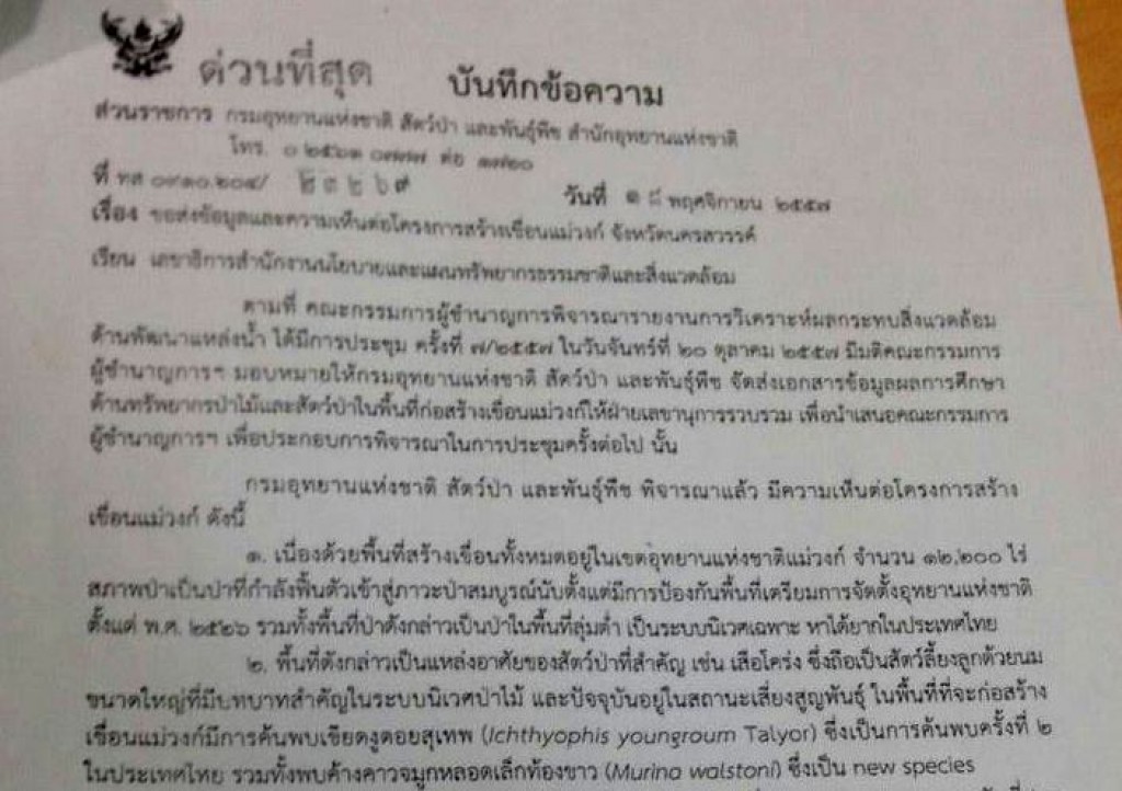 ผู้สื่อข่าวรายงานว่า นายนิพนธ์ โชติบาล อธิบดีกรมอุทยานฯ ได้ทำหนังสือเรื่องข้อมูลและความเห็นต่อโครงการก่อสร้างเขื่อนแม่วงก์ จ.นครสวรรค์ ถึงนายเกษมสันต์ จิณณวาโส เลขาธิการ สผ.เพื่อประกอบการพิจารณาของ คชก.ด้านแหล่งน้ำ โดยมีสาระสำคัญระบุว่า เนื่องด้วยพื้นที่ก่อสร้างเขื่อนแม่วงก์อยู่ในอุทยานฯ แม่วงก์ จำนวน 12,200 ไร่ สภาพเป็นป่าที่กำลังฟื้นตัวเข้าสู่สภาวะป่าสมบูรณ์ นับตั้งแต่ พ.ศ.2526 รวมทั้งพื้นที่ป่าดังกล่าวเป็นป่าในพื้นที่ลุ่มต่ำ เป็นระบบนิเวศเฉพาะ หาได้ยากในประเทศไทย
