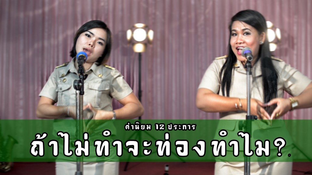 "ค่านิยม 12 ประการ" ที่ทางคณะรักษาความสงบแห่งชาติ หรือคสช. ได้มอบ ให้ทุกหน่วยทั้งทหาร กำลังพล และครอบครัว ร่วมยึดถือและปฏิบัติตาม เพื่อเสริมสร้างคุณธรรมและจริยธรรมอันดีงามให้แก่สังคมไทยแล้ว ล่าสุด ครูภาษาไทย 2 ท่าน ซึ่งหนึ่งในนั้น เธอเป็นที่รู้จักกันบนโลกโซเชียลอยู่บ้างแล้ว จากคลิป "รวมเพลงเด็กในตำนาน" ที่มียอดคนดูถึง 3 ล้านกว่าวิวแล้วในขณะนี้ คุณครูท่านนี้ก็คือ "ครูนกเล็ก" หรือ "น.ส.จีรภัทร์ สุกางโฮง" อาจารย์สอนวิชาภาษาไทย จากโรงเรียนบางมด (ตันเปาว์ วิทยาคาร) ประกบไมค์กับ "ครูแจง" น.ส.สุพรรษา ผลพัฒนา ครูดนตรี โรงเรียนวัดอ่างแก้ว ร่วมกันทำคลิปใหม่ขึ้นมา โดยดัดแปลงทำนองมาจากเพลงฮิต "ไม่รัก ไม่ต้อง" จากสองสาวดูโอ นิว-จิ๋ว นั่นเอง จะเพราะ และได้ใจความอย่างไรบ้าง ลองฟังกันดู