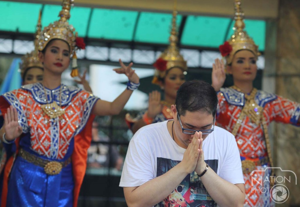 นักท่องเที่ยวพนมมือพร้อมทั้งอธิษฐานโดยมีนางรำแก้บนรำอยู่บริเวณด้านหลังเพื่อแก้บนในสิ่งที่ตนเองขอและตอนนี้นางรำได้กลับมารับรำแก้บนตามปกติภายหลังจากเกิดเหตุการณ์ระเบิดที่แยกราชประสงค์เมื่ออาทิตย์ที่ผ่านมา ที่ ศาลพระพรหมเอราวัณ แยกราชประสงค์
