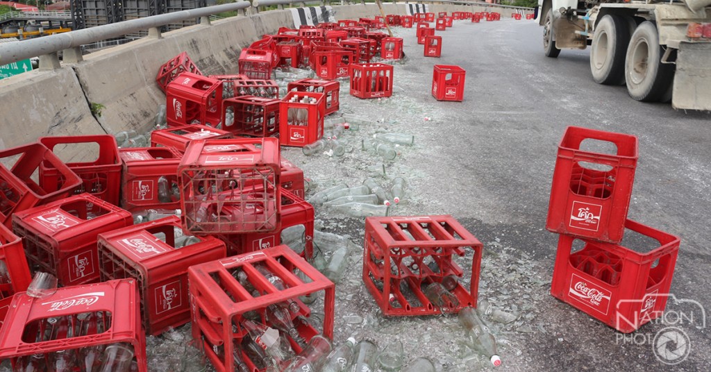 ที่เกิดเหตุพบรถเทเลอร์ยี่ห้อมิตซูบิชิฟูโซ่หมายเลขทะเบียน 78-7674 กรุงเทพมหานคร ตัวพ่วง 78-7675 กรุงเทพมหานคร จอดอยู่ 1 คันและที่พื้นถนนพบลังที่บรรจุขวดโค้กขนาด 1 ลิตร ที่เป็นแบบแก้วประมาณ 100 ลัง ร่วงหล่นอยู่เต็มถนนเจ้าหน้าที่จึงต้องมาช่วยกันเก็บกวาดเข้าข้างทางก่อน เพราะเกรงว่ารถที่ขับมาด้านหลังจะทับเศษขวดแตกได้รับอันตรายทิ่มยางระเบิดขึ้นได้และเปิดการจราจรไม่ให้รถติดสะสมได้จากการสอบถามนายบุญตา อินไธสง อายุ 49 ปี คนขับรถเทเลอร์บรรทุกขวด บอกว่าตนเองขับรถรับขวดมาจาก จ.พระนครศรีอยุธยา และจะนำไปส่งที่บริษัทโค้กย่านบางแขยง อ.เมืองปทุมธานี เมื่อมาถึงที่เกิดเหตุเป็นทางโค้งต่างระดับเชือกที่รัดลังได้ขาดทำให้ลังบรรจุขวดร่วงหล่นลงมาเต็มถนน ด้านเจ้าหน้าที่ตำรวจจึงได้นำตัวไปเปรียบเทียบปรับที่ สภ.ปากคลองรังสิต