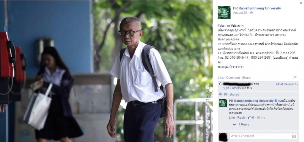 หลังจากมีการแชร์และโพสต์กันไปในโลกออนไลน์ รายการโทรทัศน์ต่างๆตามหาตัวคุณตาในชุดนักศึกษา ล่าสุดทางเพจ "PR Ramkhamhaeng University" ได้ออกมาประกาศ หากพบเจอให้ติดต่อกลับมาหาทางเพจด้วย ที่งานประชาสัมพันธ์ มร.อาคารสุโขทัย ชั้น 2 ห้อง 205 โทร. 02-310-8045-47, 083-294-269