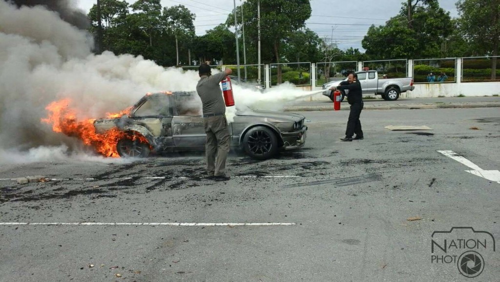 ที่เกิดเหตุพบรถยนต์เก๋ง ยี่ห้อบีเอ็มดับเบิ้ลยู สีดำ สภาพแต่งซิ่งเป็นรถดริฟท์ สภาพถูกเพลิงลุกไหม้บริเวณท้ายรถจนลุกลามไปทั้งคัน เจ้าหน้าที่จึงใช้ถังสารเคมีฉีดสกัดเพลิงไหม้ในเบื้องต้นแต่ไม่เป็นผล จึงระดมกำลังฉีดน้ำสกัดโดยเวลาประมาณ 40 นาทีเพลิงจึงสงบ