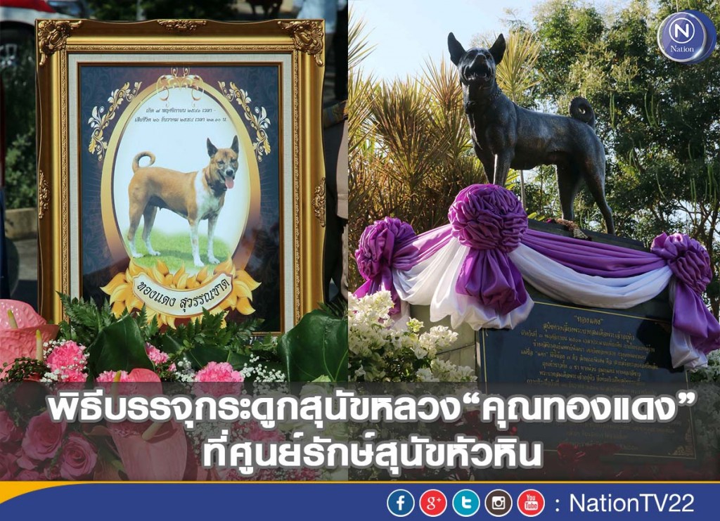 นายอำเภอหัวหิน, นายกเทศมนตรีหัวหิน, ผอ.รพ. หัวหิน และเจ้าหน้าที่กองงานสุนัขหลวง สำนักพระราชวัง ร่วมในพิธีบรรจุกระดูก สุนัขหลวงคุณทองแดง ที่ฐานอนุสาวรีย์ ที่บริเวณศูนย์รักษ์สุนัขหัวหิน อ.หัวหิน จ.ประจวบคีรีขันธ์ เมื่อวันที่ 30 ธ.ค. 2558 หลังคุณทองแดงตาย ณ วังไกลกังวล เมื่อวันที่ 26 ธ.ค. 2558 รวมอายุได้ 17 ปี 1 เดือน 19 วัน ภาพ วันชัย ไกรศรขจิต