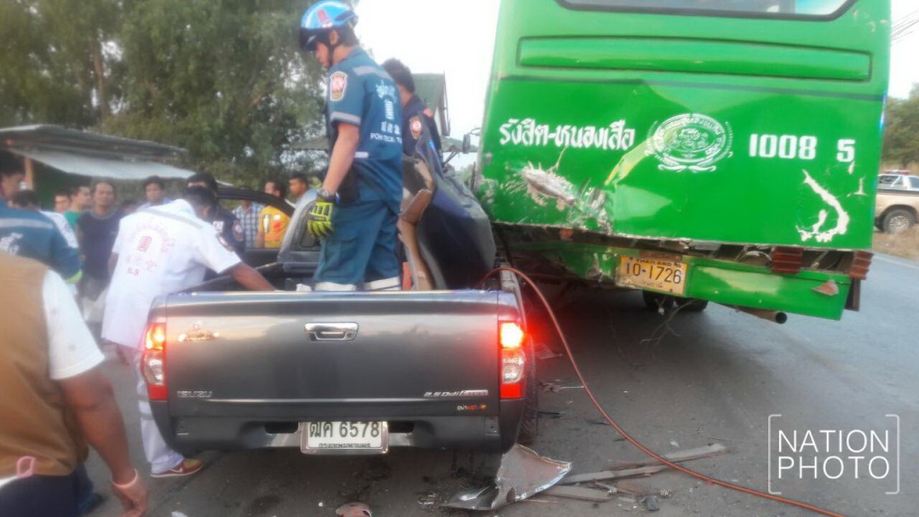 กระบะอัดยับ! ท้ายรถเมล์จอดรับผู้โดยสาร ตาย 3 ราย
