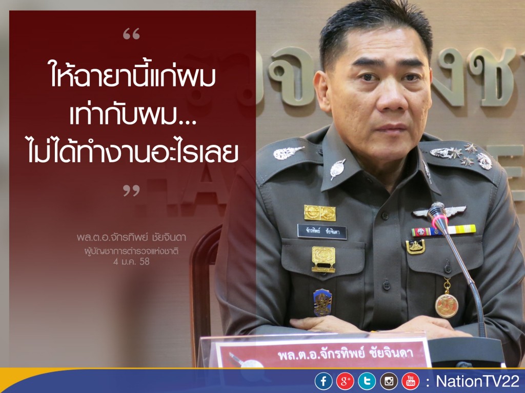ที่สำนักงานตำรวจแห่งชาติ (สตช.) เมื่อเวลา 11.00 น. วันที่ 4 มกราคม พล.ต.อ.จักรทิพย์ ชัยจินดา ผู้บัญชาการตำรวจแห่งชาติ(ผบ.ตร.) กล่าวถึง กรณีคณะกรรมการบริหารสมาคมผู้สื่อข่าวและช่างภาพอาชญากรรมแห่งประเทศไทยได้ร่วมคัดเลือกชื่อให้ตนเป็น 1 ใน 11 ฉายาตำรวจประจำปี 2558 โดยมอบฉายา ผบ.เสียทรง นั้นว่า ตนต้องขอขอบคุณที่ร่วมกันตั้งฉายานี้ให้ แต่หากถามว่าเสียความรู้สึกหรือไม่นั้น ก็เสียความรู้สึก แต่ตนขอชี้แจงต่อสื่อมวลชนว่าในขณะที่ พล.ต.อ.สมยศ พุ่มพันธ์ม่วง ยังดำรงตำแหน่งเป็น ผบ.ตร. อยู่นั้น ท่านก็ไม่ได้ทำงานมากมาย แต่ท่านได้มอบหมายงานให้แก่รองผู้บัญชาการตำรวจแห่งชาติ (รองผบ.ตร.) ดำเนินการแทน ดังนั้นจะเห็นได้ว่าสมัยที่ พล.ต.อ.สมยศ ยังเป็น ผบ.ตร.อยู่ ท่านก็มอบหมายให้ตนรับผิดชอบเรื่อบงานสือบสวน งานความมั่นคง เพราะฉะนั้นบทบาทการทำงานก็ไปรวมอยู่ที่รองผบ.ตร. ส่วนรูปแบบการทำงานของ ผบ.ตร. จะดำเนินการตามรูปแบบของซีอีโอในการบริหารโดยรับนโยบายจากรัฐบาลเพื่อมาถ่ายทอดสู่การปฏิบัติ อย่างไรก็ตามการตั้งฉายาให้ตนแบบนี้ จะถือว่าไม่ให้ความเป็นธรรมกับตนเลย หรือจะไม่ให้แบ่งงานให้แก่ รองผบ.ตร. และมอบภาระให้ตนทำงานคนเดียว ตนก็ทำได้ แต่หลักการบริหารงานจะผิด เพราะในส่วนของการบริหารงานบุคคลจะต้องกระจายให้แก่ รองผบ.ตร.บริหารงานเท่านั้น