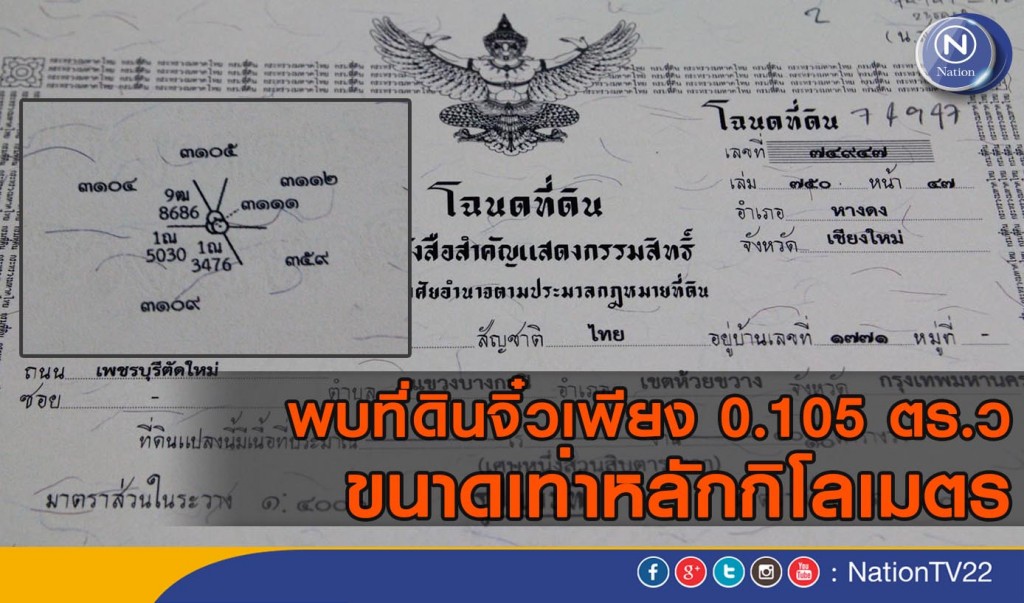 โดยบริเวณสำนักงานที่ดินอำเภอหางดง จังหวัดเชียงใหม่ พบนายโกมล บัวทอง ผู้ตรวจราชการกรมที่ดิน เขตตรวจราชการที่ 6 นายชูชาติ รักษาวงศ์ เจ้าพนักงานที่ดินจังหวัดเชียงใหม่ สาขาหางดงพร้อมเจ้าหน้าที่กำลังนำโฉนดที่ดินจิ๋วดังกล่าวมาตรวจสอบ ขนาดคือ 001 ส่วน10 ซึ่งเป็นของบริษัท พูนสิน พร็อพเพอร์ตี้ จำกัด หรือหมู่บ้านทิพภิรมย์ ต.หางดง อ.หางดง จ.เชียงใหม่ ออกโฉนดเมื่อวันที่ 9 ธ.ค.2558 มีความยาว 1.29 เมตร และความยาว 1.14 เมตร ฐานกว้าง 0.73 เมตร คำนวนเนื้อที่ได้ 0.105 ตารางวา