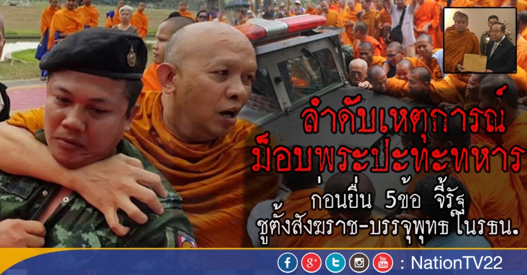 เมื่อเวลา 08.00 น. เจ้าหน้าที่ทหาร กองพันทหารช่างที่ 9 กองพลทหารราบที่ 9 ค่ายสุรสีห์ จ.กาญจนบุรี และเจ้าหน้าที่ตำรวจ สภ.พุทธมณฑล จำนวนกว่า 50 นาย ได้เข้าตรึงกำลังดูแลความสงบเรียบร้อยบริเวณรอบพุทธมณฑล พร้อมทั้งมีคำสั่งปิดประตูทางเข้าด้านถนนพุทธมณฑล สาย 4 ไม่ให้รถยนต์ทุกชนิดเข้าไปด้านในพุทธมณฑล ต่อมาช่วงสายวันเดียวกัน กลุ่มคณะสงฆ์และฆราวาสได้ทยอยเข้ามาชุมนุมด้านหน้าทางเข้า โดยมีเจ้าหน้าที่เข้าชี้แจงทำความเข้าใจเพื่อร้องขอไม่ให้เข้าร่วมชุมนุม เนื่องจากขัดคำสั่งของคณะรักษาความสงบแห่งชาติ (คสช.) นอกจากนี้ทหารได้นำลวดหนามขึงกั้นบริเวณปากทางเข้าไม่ให้รถเข้าไปได้ คณะสงฆ์จึงเข้าเจรจาและให้นำลวดหนามออกปล่อยให้รถเข้าไป แต่ไม่เป็นผล คณะสงฆ์จึงช่วยกันรื้อรั้วลวดหนามแล้วนำรถฝ่าเข้าไปม็อบพระปะทะทหารถึงล็อกคอ