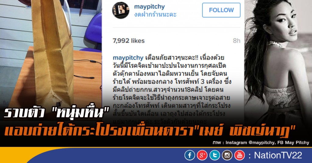 เมื่อเวลา 22.00 น.วันที่ 2 มีนาคม 59 ผู้สื่อข่าวรายงานว่า น.ส.พิชญ์นาฏ สาขากร หรือ เมย์ พิชญ์นาฏ ดารานักแสดงชื่อดัง ได้โพสต์คลิปวีดีโอในแอพคิเคชั่นอินตราแกรม ดาราสาว เป้ย ปานวาด กำลังพูดถึงผู้ต้องหาที่ถ่ายใต้กระโปรงตัวเอง พร้อมระบุข้อความใต้คลิปว่า ประกาศ!! รายชื่อต่อไปนี้ (ที่มางานไอติมหวานเย็น) โดนแอบถ่ายใต้กระโปรง ให้ไปพร้อมกันที่สน. ตอนนี้เจ้าหน้าที่ตร.จับคนร้ายได้แล้ว @pang_ornjira @ppanward น้องพลอยที่เดินแบบตะกี้ค่ะ ติดต่อกลับด่วนนะคะ และรูปถุงกระดาษของกลางที่มีการเจาะรูไว้
