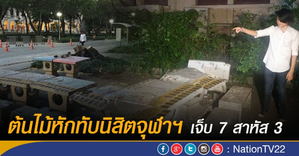 ส่วนที่โดนพวกตนกับเพื่อนเป็นเฉพาะกิ่ง ส่วนลำต้นหักไปทางด้านซ้ายมือ ระหว่างนั้นตนเห็นเพื่อนที่ติดอยู่ในกิ่งไม้ขยับตัวไม่ได้ จึงรีบแจ้งเจ้าหน้าที่ให้มาช่วยเหลือ ก่อนที่รถกู้ชีพจะนำตัวคนเจ็บส่ง รพ.จุฬาฯ เหตุที่เกิดขึ้นครั้งนี้คาดว่าเกิดจากอายุของต้นไม้ที่ปลูกมาอย่างยาวนาน