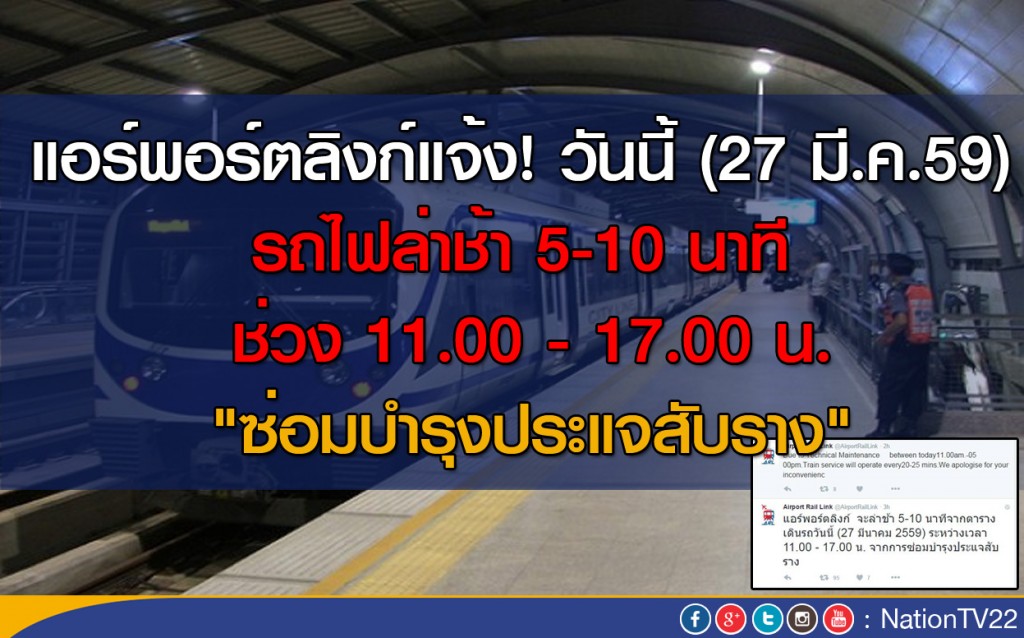 แอร์พอร์ตลิงก์ จะล่าช้า 5-10 นาทีจากตารางเดินรถวันนี้ (27 มีนาคม 2559) ระหว่างเวลา 11.00 - 17.00 น. จากการซ่อมบำรุงประแจสับราง