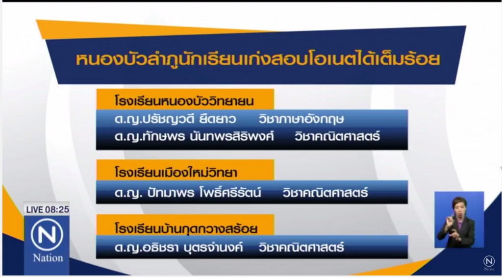 ได้แก่ ด.ญ.ปรัชญวดี ยืดยาว วิชาภาษาอังกฤษ และในรายวิชาคณิตศาสตร์ คือ ด.ญ.ทักษพร นันทพรสิริพงศ์ ที่โรงเรียนเมืองใหม่วิทยา อ. ศรีบุญเรือง ในรายวิชาคณิตศาสตร์ คือ ด.ญ. ปัทมาพร โพธิ์ศรีรัตน์ ซึ่งสมัครเข้าเรียนต่อ ม.1 ที่โรงเรียนขอนแก่นวิทยายน จ.ขอนแก่น และ โรงเรียนบ้านกุดกวางสร้อย อ.โนนสัง ในรายวิชา คณิตศาสตร์ ได้แก่ ด.ญ.อธิชรา บุตรจำนงค์ ซึ่งหลังจากในช่วงเย็นของวันที่ 27 มีนาคม 2559 ในกลุ่มไลน์ของ ผู้บริหาร สพป.หนองบัวลำภู เขต 1 ได้ มีการเปิดเผยรายชื่อนักเรียนที่มีผลคะแนนสอบได้คะแนนเต็ม ต่างมีผู้บริหารโรงเรียนในสังกัดได้ ส่งไลน์แสดงความยินดีกันอย่างคึกคัก