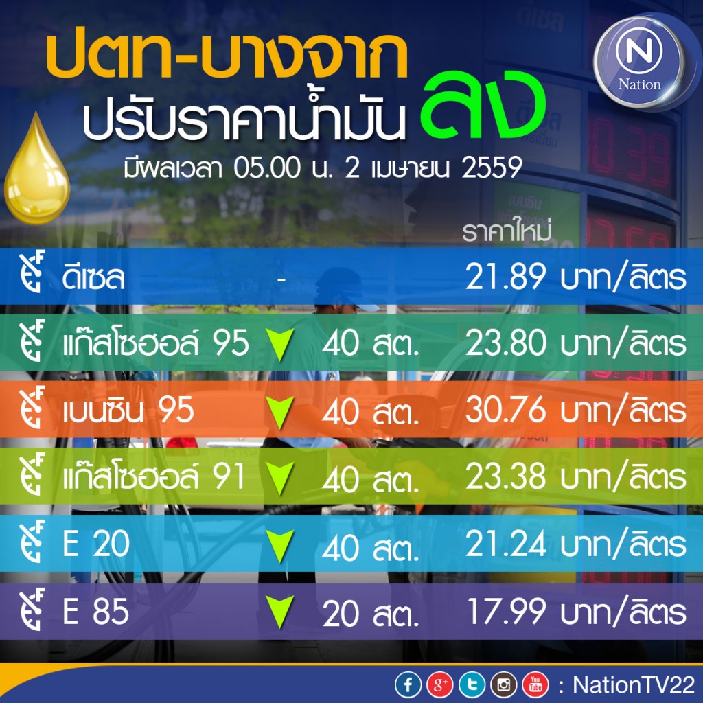 ปตท.-บางจาก ปรับลดราคาขายปลีกน้ำมันกลุ่มเบนซิน 40 สตางค์/ลิตร เว้น E85 ลดลง 20 สตางค์/ลิตร (ดีเซล คงเดิม) มีผลพรุ่งนี้ (2 เม.ย.59) เวลา 05.00 น.