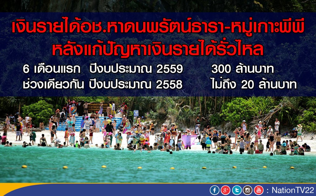 นายศรายุทธ ตันเถียรหัวหน้าอุทยานแห่งชาติหาดนพรัตน์ธารา-หมู่เกาะพีพี จ.กระบี่ บอกว่า ได้รายงานผลการจัดเก็บเงินรายได้อุทยานแห่งชาติหาดนพรัตน์ธารา-หมู่เกาะพีพี ซึ่งมีตัวเลขสูงถึง 300 ล้านบาทเพียงแค่ 6 เดือนของปีงบประมาณ 2559 ให้แก่อธิบดีกรมอุทยานแห่งชาติสัตว์ป่าและพันธุ์พืชทราบแล้ว