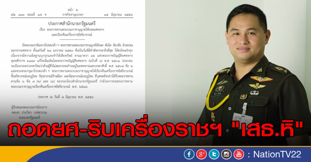 วันนี้ (15 มิ.ย.) เว็บไซต์ราชกิจจานุเบกษา เผยแพร่ประกาศสำนักนายกรัฐมนตรี เรื่อง พระราชทานพระบรมราชานุญาตให้ถอดยศทหารและเรียกคืนเครื่องราชอิสริยาภรณ์