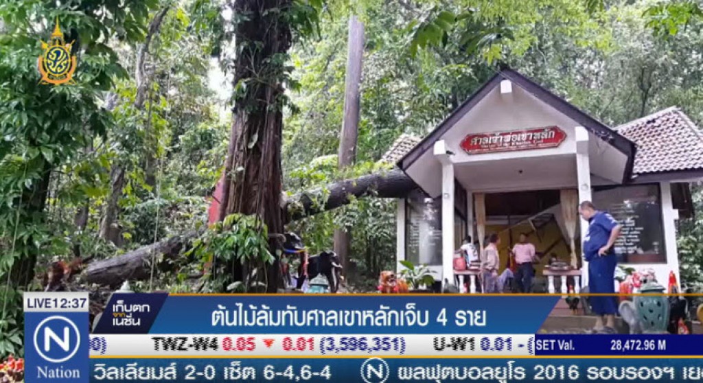 อุบัติเหตุต้นตะเคียนขนาดใหญ่ ล้มทับศาลพ่อตาเขาหลัก บริเวณหน้าป้อมตำรวจเขาหลัก ต.คึกคัก อ.ตะกั่วป่า เกิดขึ้นเมื่อเย็นวานนี้ ขณะที่ชาวบ้านกำลังไหว้ศาล และหลบฝนอยู่ ทำให้มีผู้ได้รับบาดเจ็บทันที 4 ราย เป็นหญิงอายุระหว่าง 32-35 ปี 2 ราย เด็กหญิงอายุประมาณ 4-6 ขวบ 1 ราย และเป็นชายอายุประมาณ 35-40 ปี 1 ราย ส่วนใหญ่มีแผลถลอกตามร่างกาย และอยู่ในอาการที่ตื่นเต้นตกใจ เจ้าหน้าที่ตำรวจ ได้เข้าไปช่วยเหลือเบื้องต้น ก่อนเจ้าหน้าที่กู้ภัยเขาหลัก นำตัวส่ง โรงพยาบาลตะกั่วป่า