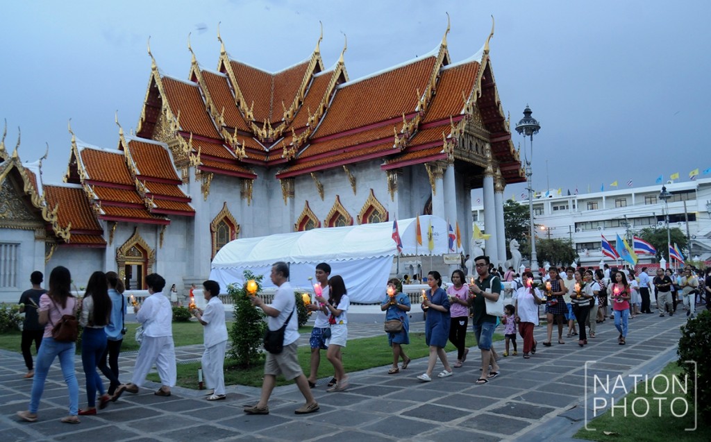 พุทธศาสนิกชนจำนวนมาก พาครอบครัวมาเวียนเทียนเนื่องในวันอาสาฬหบูชา ณ วัดเบญจมบพิตรดุสิตวนาราม ราชวรวิหาร เมื่อช่วงค่ำวันที่ 19 กรกฎาคม 2559