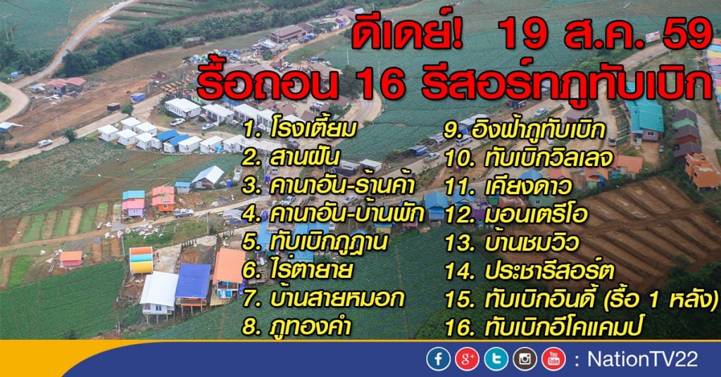 สำหรับรายชื่อ 16 รีสอร์ท คณะเจ้าหน้าที่เตรียมเข้ารื้อถอนสิ่งปลูกสร้างในวันที่ 19 สิงหาคมนี้ ได้แก่ 1.โรงเตี๊ยม 2.สานฝัน 3. คานาอัน-ร้านค้า 4. คานาอัน-บ้านพัก 5.ทับเบิกภูฎาน 6.ไร่ตายาย 7. บ้านสายหมอก 8. ภูทองคำ 9.อิงฟ้าภูทับเบิก 10. ทับเบิกวิลเลจ 11. เคียงดาว 12. มอนเตรีโอ 13. บ้านชมวิว 14.ประชารีสอร์ต 15.ทับเบิกอินดี้ (รื้อ 1 หลัง) 16.ทับเบิกอีโคแคมป์