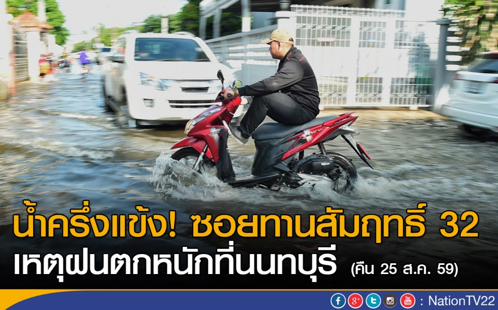 สภาพน้ำขังในซอยทานสัมฤทธิ์ 32 ทางเชื่อมกับถนนสามัคคี จ. นนทบุรี เมื่อเวลา 8.40 น. ของวันที่ 26 สิงหาคม 2559 เป็นผลสืบเนื่องจากฝนตกหนักที่นนทบุรีเมื่อวันที่ 25 สิงหาคมที่ผ่านมา โดยระดับน้ำประมาณครึ่งหน้าแข้ง ส่งผลให้การจราจรติดขัดและโรงเรียนต้องงดการเรียนการสอน