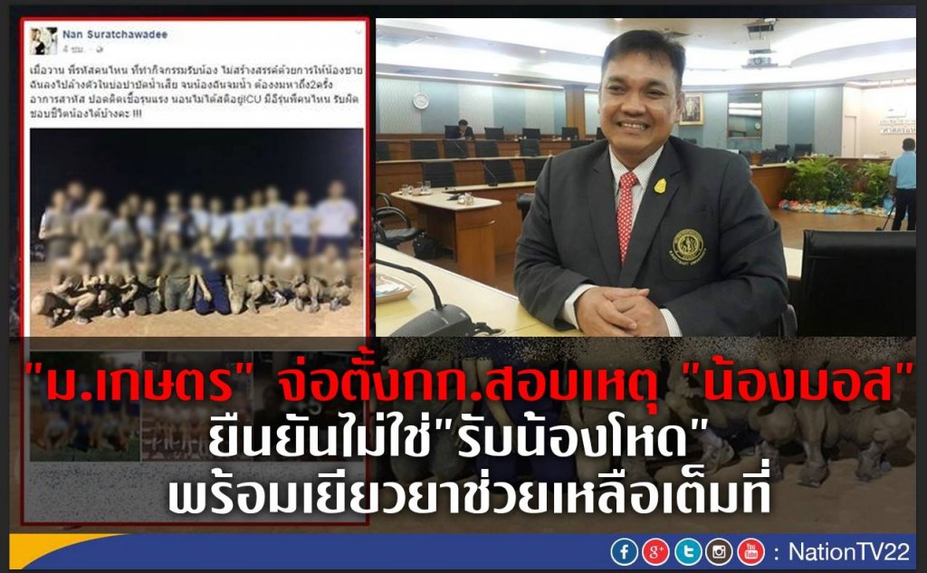 "เหตุการณ์ที่เกิดขึ้น และมีการแชร์ในโลกโซเซียลนั้น บางเรื่องราวก็ไม่ได้เป็นความจริง อย่าง บ่อน้ำที่เกิดเหตุ ขอยืนยันว่าไม่มีใช่บ่อบำบัดน้ำเสีย หรือบ่อสารเคมี แต่อย่างใด เป็นบ่อน้ำฝนที่มหาวิทยาลัยใช้ฝึกปฎิบัติ และทำกิจกรรมต่างๆ ของคณะพาณิชย์นาวีอยู่แล้ว เพราะคณะนี้ต้องทำกิจกรรมเกี่ยวข้องกับน้ำ ซึ่งในวันที่เกิดขึ้นก็ไม่แน่ชัดว่าสภาพร่างกายของนิสิตเป็นเช่นใด ทางมหาวิทยาลัยจะตรวจสอบหาข้อเท็จจริงเรื่องนี้ และรับผิดชอบอย่างเต็มที่ แต่ตอนนี้ขอให้นิสิตปลอดภัยก่อน" อธิการบดี มก.และว่ามก.ได้มีการประกาศนโยบายการรับน้องสร้างสรรค์ ทำความเข้าใจกับคณาจารย์ และรุ่นพี่ทุกคณะ ทุกวิทยาเขตของมหาวิทยาลัย โดยเฉพาะการไม่มีการกิจกรรมรุนแรง การข่มขู่บังคับ ซึ่งเหตุการณ์ดังกล่าว เชื่อว่าไม่มีใครอยากให้เกิดขึ้น