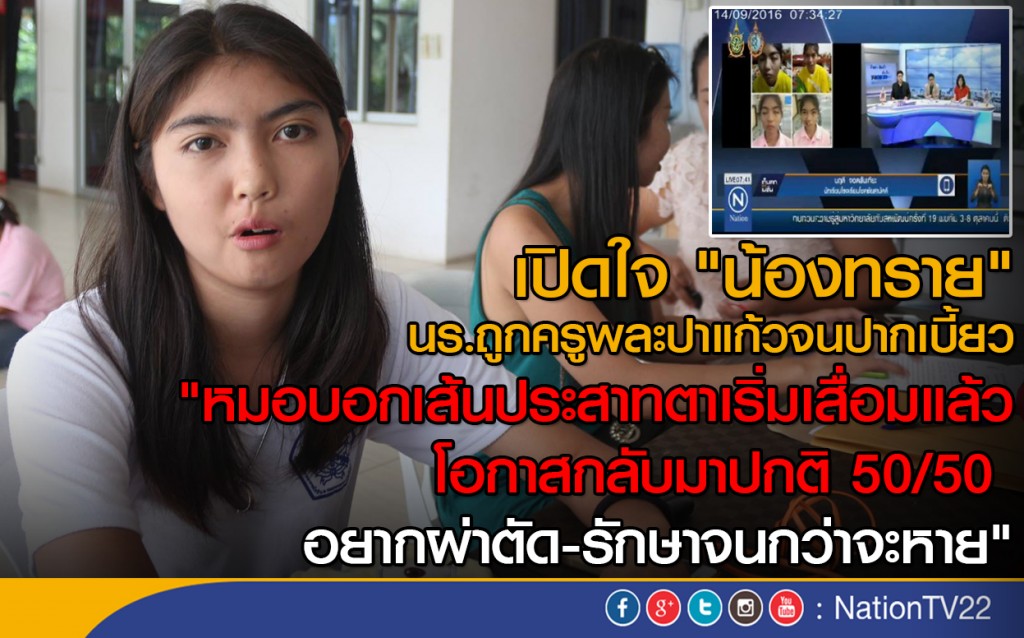 พิธีกร : ครูคนที่ก่อเหตุตกลงจนถึงวันนี้เขาช่วยอะไรบ้างน้องทราย : ครูและโรงเรียนรวมกันช่วยค่ารักษาพยาบาลเบื้องต้น ประมาณ 40,000 บาท