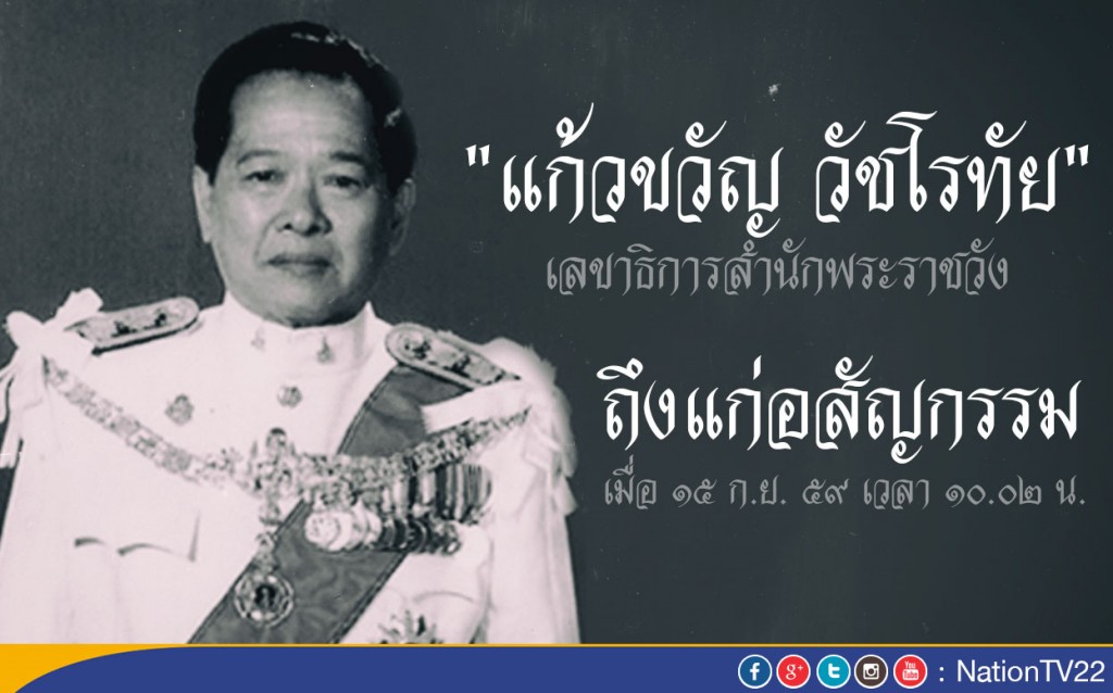 เมื่อวันที่ 15 ก.ย. 59 ศ.นพ.ประสิทธิ วัฒนาภา คณบดีคณะแพทย์ศาสตร์ ศิริรราชพยาบาล เปิดเผยว่า นายแก้วขวัญ วัชโรทัย เลขาธิการสำนักพระราชวัง ได้เข้ารับการรักษาตัวที่โรงพยาบาลด้วยภาวะกล้ามเนื้อหัวใจขาดเลือด โดยได้มีการผ่าตัดและอยู่ในความดูแลของแพทย์มาระยะหนึ่งแล้ว แต่ด้วยความที่เป็นผู้สูงอายุจึงและได้เกิดอาการสำลัก ติดเชื้อเป็นครั้งคราว ล่าสุดเมื่อช่วงเช้าที่ผ่านมาหัวใจได้หยุดเต้นเฉียบพลัน และสิ้นลมอย่างสงบเมื่อเวลา 10.02 น.สำหรับประวัตินั้น นายแก้วขวัญ วัชโรทัย อายุ 88 ปี เกิดเมื่อวันที่ 3 กันยายน พ.ศ. 2471 เป็นบุตรของพระยาอนุรักษ์ราชมณเฑียร (กาด วัชโรทัย) และท่านผู้หญิงอนุรักษ์ราชมณเฑียร (พัว วัชโรทัย) มีศักดิ์เป็นหลานน้าในสมเด็จพระนางเจ้าอินทรศักดิศจี พระวรราชชายา ในพระบาทสมเด็จพระมงกุฎเกล้าเจ้าอยู่หัว และพระสุจริตสุดา (เปรื่อง สุจริตกุล) พระสนมเอกในพระบาทสมเด็จพระมงกุฎเกล้าเจ้าอยู่หัว ชื่อ แก้วขวัญ-ขวัญแก้ว เป็นชื่อพระราชทานจากพระบาทสมเด็จพระปกเกล้าเจ้าอยู่หัว สมรสกับ ท่านผู้หญิงเพ็ญศรี วัชโรทัย (หม่อมหลวงเพ็ญศรี ศรีธวัช) มีบุตร-ธิดา 3 คน การศึกษา โรงเรียนเซนต์คาเบรียลโรงเรียนอัสสัมชัญศรีราชา ปริญญาตรีสาขาวิชาเกษตรกรรม ที่ฟรีบูร์โดยได้รับพระมหากรุณาธิคุณเป็นนักเรียนในพระบรมราชูปถัมภ์ ตามเสด็จฯ ไปศึกษาที่ประเทศสวิตเซอร์แลนด์ Certificated "Advanced Management Program" ที่มหาวิทยาลัยฮาร์วาร์ด สหรัฐอเมริกา ด้วยทุนส่วนพระองค์การทำงานนายแก้วขวัญ เริ่มรับราชการที่สำนักพระราชวัง ตั้งแต่วันที่ 1 เมษายน พ.ศ. 2493 ทำหน้าที่มหาดเล็กและนายเวรห้องพระบรรทม เป็นช่างถ่ายภาพยนตร์ส่วนพระองค์ ตามเสด็จฯ ไปถ่ายทำภาพยนตร์ส่วนพระองค์ตามจังหวัดต่าง ๆ และต่างประเทศเกือบทั่วโลก เป็นผู้จัดทำภาพยนตร์ส่วนพระองค์ออกฉายพ.ศ. 2505 เป็นผู้ช่วยหัวหน้ากองมหาดเล็ก ผู้จัดการโรงโคนมสวนจิตรลดา ผู้กำกับราชการส่วนสวนพระราชวังดุสิต และเป็นผู้จัดการกองทุนสวัสดิการในพระบรมราชูปถัมภ์พ.ศ. 2509 รับพระมหากรุณาพระราชทานให้อุปสมบทเป็นนาคหลวงในพระอุโบสถวัดพระศรีรัตนศาสดาราม และจำพรรษาที่วัดบวรนิเวศวิหารพ.ศ. 2515 หลังจบการศึกษาจากสหรัฐอเมริกา ทรงพระกรุณาโปรดเกล้าฯ ให้ปฏิบัติหน้าที่ฝ่ายการเงิน มีหน้าที่ตรวจตราและควบคุมการบริหารงานในกองคลังเพิ่มเติมจากหน้าที่เดิมพ.ศ. 2521 เลื่อนเป็นรองเลขาธิการพระราชวัง คนที่ 2พ.ศ. 2530 โปรดเกล้าฯ ให้ดำรงตำแหน่งเลขาธิการพระราชวัง เมื่อวันที่ 28 กรกฎาคม พ.ศ. 2530 และโปรดเกล้าฯ ให้ดำรงตำแหน่งผู้อำนวยการโครงการส่วนพระองค์ สวนจิตรลดานอกจากง
