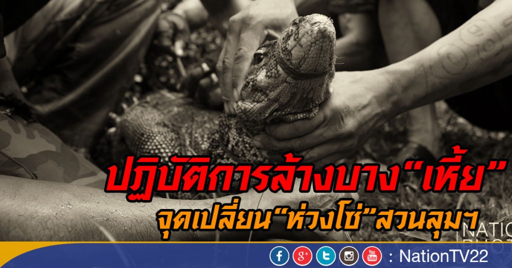 นาทีนั้นเจ้าหน้าที่ได้ยืนประจันหน้าเหี้ยบนขอบบึง ก่อนตัดสินใจใช้เหยื่อโยนลงบ่อเพื่อล่อเหี้ยอีกครั้ง แรงต่อสู้ของมันทำให้ผิวน้ำกระจายเป็นระลอกใหญ่ จนในที่สุดก็ต้องแพ้แรงมนุษย์ และถูกหิ้วขึ้นมาพ้นน้ำสำเร็จ มันมีน้ำหนักไม่ต่ำกว่า 20 กิโลกรัม ลำตัวหัวถึงหางยาวไม่ต่ำกว่า 2 เมตร สีผิวเคลือบเงาดูดุดัน แต่เมื่อร่างของมันถูกพันธนาการด้วยเชือกที่มัดทั้งมือและปาก ก่อนถูกจับใส่กระสอบป่านที่ถูกน้ำชุ่มไว้ สีหน้า แววตา อิสระภาพสุดท้ายภายในสวนลุมพินีก็จบลง