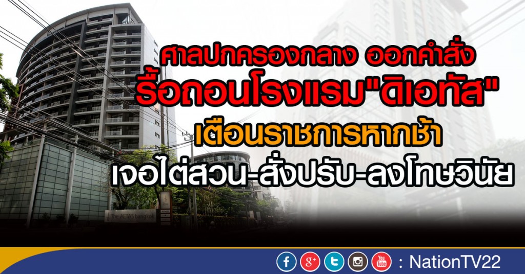 ดังนั้นศาลปกครองกลาง จึงมีคำสั่งให้ ผอ.เขตปทุมวัน และผู้ว่าฯ กทม. ผู้ถูกฟ้องที่ 1-2 ใช้อำนาจตาม พ.ร.บ.ควบคุมอาคาร มาตรา 42-43 ดำเนินการกับอาคารโรงแรมดิเอทัสและอาคารเซอร์วิสอพาร์ตเม้นท์ดิเอทัส เรสซิเด้นซ์ ของบริษัทลาภประทาน จำกัดและบริษัท ทับทิมทร จำกัดที่ตั้งอยู่ภายในซ.ร่วมฤดี เขตปทุมวันแล้วแต่กรณีโดยเร็วนับแต่วันที่ได้รับทราบคำสั่งศาล ซึ่งตามกฎหมายนั้นกำหนดให้เจ้าพนักงานท้องถิ่นมีอำนาจสั่งให้เจ้าของหรือผู้ครอบครองอาคารดำเนินการรื้อถอนอาคารนั้นทั้งหมด หรือบางส่วนได้ภายในระยะเวลาที่กำหนด แต่ต้องไม่น้อยกว่า 30 วันโดยให้ดำเนินการตามหลักเกณฑ์วิธีการและเงื่อนไขที่กฎหมายกำหนด หากเจ้าของอาคารไม่ดำเนินการฯ ให้เจ้าพนักงานท้องถิ่นร้องต่อศาลให้จับกุมเจ้าของอาคาร และดำเนินการรื้อถอนอาคารดังกล่าวโดยเจ้าของอาคารต้องเป็นผู้ออกค่าใช้จ่ายในการรื้อถอนทั้งหมด