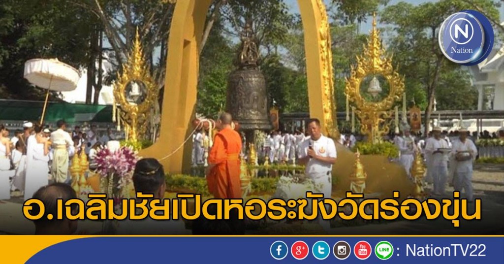 เมื่อวันที่ 9 ต.ค.59 ผู้สื่อข่าวรายงานว่า ที่วัดร่องขุ่น ต.ป่าอ้อดอนชัย อ.เมือง จ.เชียงราย อ.เฉลิมชัย โฆษิตพิพัฒน์ ศิลปินแห่งชาติชื่อดัง ได้จัดพิธีเปิดระฆังวัดร่องขุ่น ซึ่งได้ก่อสร้างแล้วเสร็จ ตั้งอยู่ใกล้กับกุฏิพระภิกษุภายในวัดและอยู่ด้านข้างต้นโพธิ์ซึ่งเป็นสถานที่ประดิษฐานพระพุทธประทานโชคลาภ มีพุทธศาสนิกชนและชมรมรักสะสมพุทธศิลป์ และประชาชนทั่วไปเข้าร่วมในพิธีเปิดกว่า 2,000 คน โดยพิธีจัดให้มีขบวนแห่ทางพุทธศิลป์จากโรงหล่อภายในวัดไปยังบริเวณหอระฆังแห่งใหม่ สำหรับระฆังนั้น เป็นสีทองเข้มออกดำใบใหญ่ หล่อด้วยลวดลายศิลปะล้านประยุกต์ตามรูปแบบของอาจารย์เฉลิมชัย มีลวดลายสำคัญตรงกลางเป็นองค์พระสัมมาสัมพุทธเจ้าและพญานาค ส่วนหอระฆังออกแบบเป็นสีทอง ส่วนบนมีลวดลายที่งดงามเป็นเอกลักษณ์เฉพาะ มีระฆังเล็กเป็นสีเงินห้อยอยู่ตรงกลางวงกลมภายในรูปทรงศิลปะ มีสระน้ำที่ร่มรื่นโดยมีน้ำอยู่ภายในสระทรงกลม ล้อมด้วยต้นไม้ดอกไม้ประดับ ทำให้นักท่องเที่ยวที่ไปชมอุโบสถขาวและสถานที่อื่นๆ