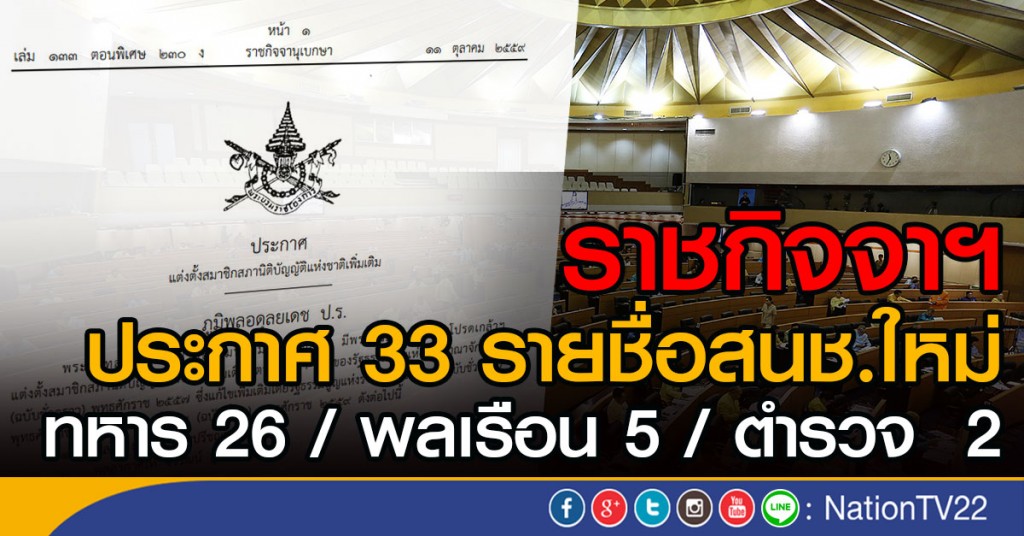 ผู้สื่อข่าวรายงานว่า ตามที่ได้มีพระบรมราชโองการโปรดเกล้าฯ แต่งตั้งสมาชิกสภานิติบัญญัติแห่งชาติเพิ่มเติม จำนวน 33 คน แล้วนั้น สำนักงานเลขาธิการวุฒิสภา ปฏิบัติหน้าที่สำนักงานเลขาธิการสภานิติบัญญัติแห่งชาติ ได้กำหนดรับรายงานตัวสมาชิกสภานิติบัญญัติแห่งชาติ ในวันพุธที่ 12 ตุลาคม 2559 ระหว่างเวลา 08.30-16.30 นาฬิกา ณ ห้องโถง ชั้น 1 อาคารรัฐสภา 2 โดยเอกสารที่จะต้องนำไปยื่นสำหรับการรายงานตัว ประกอบด้วย 1. สำเนาบัตรประจำตัวประชาชน 2. สำเนาบัตรประจำตัวประชาชนคู่สมรส 3. สำเนาทะเบียนบ้าน 4. สำเนาใบสำคัญการสมรส 5. รูปถ่ายหน้าตรง ขนาด 1 นิ้ว จำนวน 6 รูป และขนาด 3 นิ้ว จำนวน 6 รูป ทั้งนี้ สามารถสอบถามรายละเอียดเพิ่มเติมได้ที่ โทร. 081-9408713