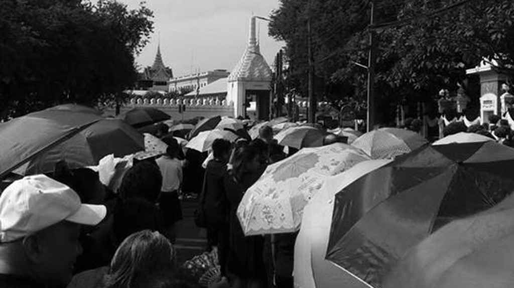 พสกนิกรชาวไทยสวมใส่ชุดสีดำ ร่วมถวายความอาลัยพระบาทสมเด็จพระเจ้าอยู่หัวฯในพระบรมโกศ ณ วัดพระแก้ว ประตูวิเศษไชยศรี